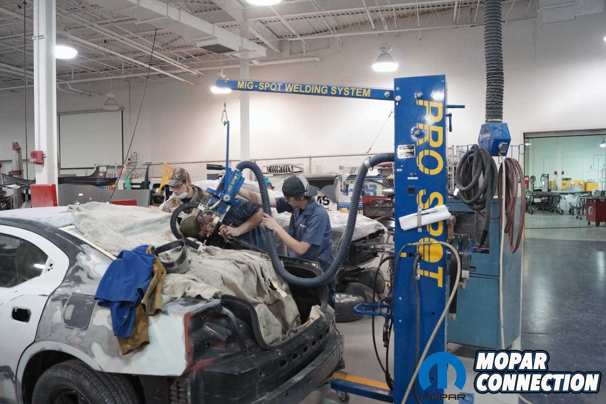 The students fitted the trunk lid and the taillight housing to the Charger. They moved the quarter panel (at the taillight area) to the proper location to maintain the gap between the trunk lid, the bumper cover, and the taillight housing. With the quarter panel measured for proper gaps, the rear of the quarter panel was welded into place with the resistance welder.