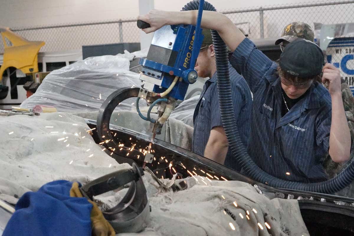 The students established the rear passenger door and quarter panel gap. Then, the quarter panel was clamped into place, and the students employed a resistance spot welder to apply a few tack welds to the quarter panel at the C-pillar and the dogleg areas. The resistance spot welder is designed to provide a weld as strong as the factory assembly line.