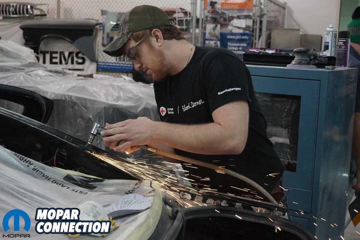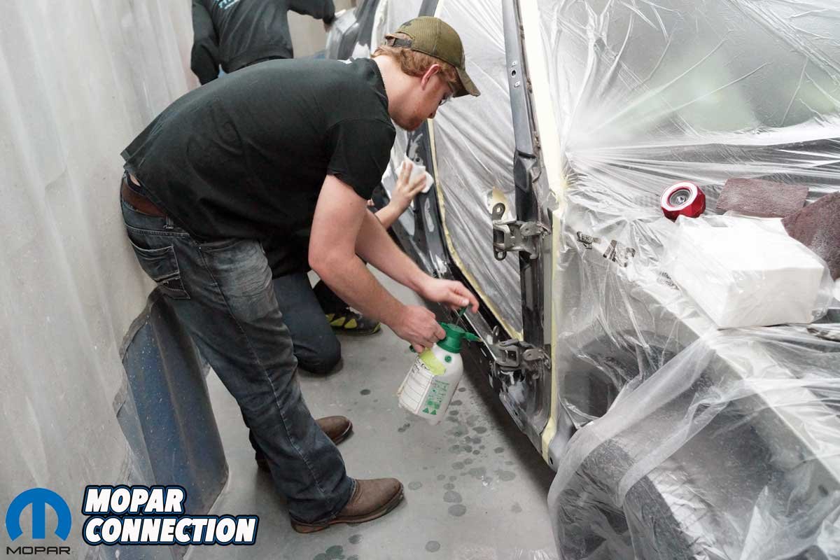 Above Left: The Charger was rolled into one of the prep booths. It was taped off, and the dust was blown off with dry, compressed air. Above Right: Zach did a final cleaning with prep solvent. The students wiped down the Charger one last time.