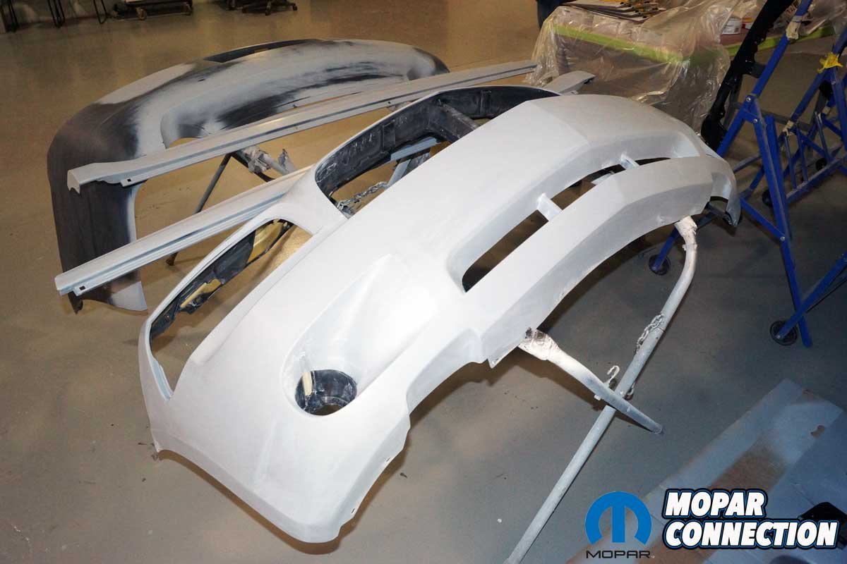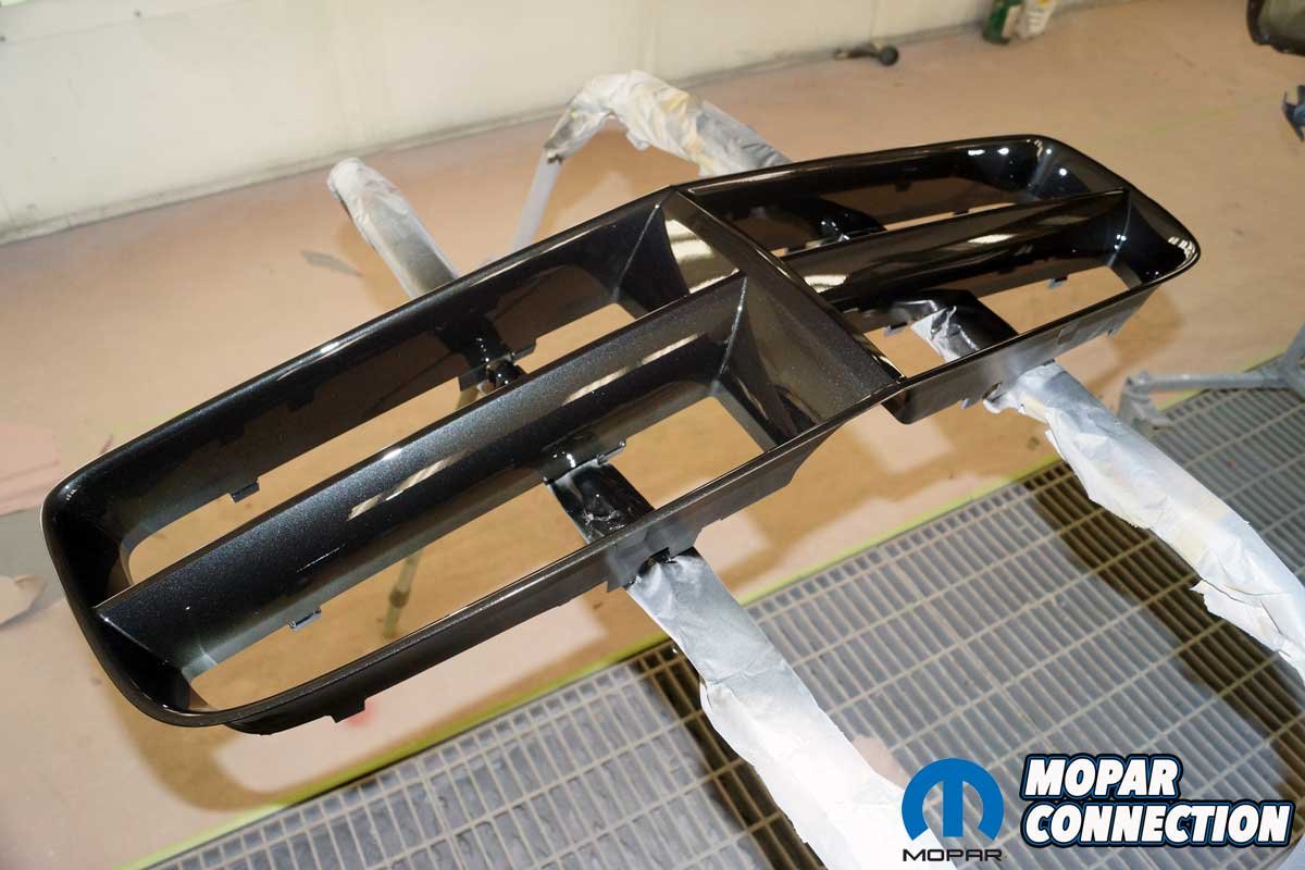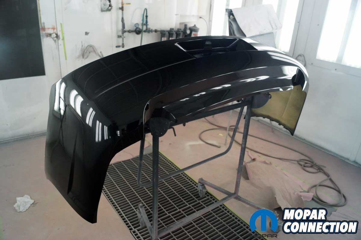 After the proper drying time, a traditional DuPont solvent-based clear coat was applied to the cover. Coming out of the paint booth, the bumper cover looked almost ready to install. However, its combination of curves and turns made it one of the most challenging parts to paint on the Charger.