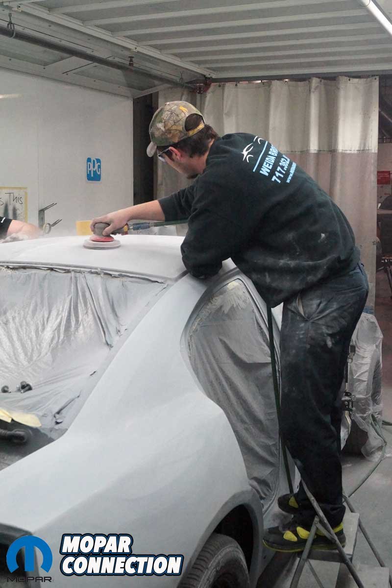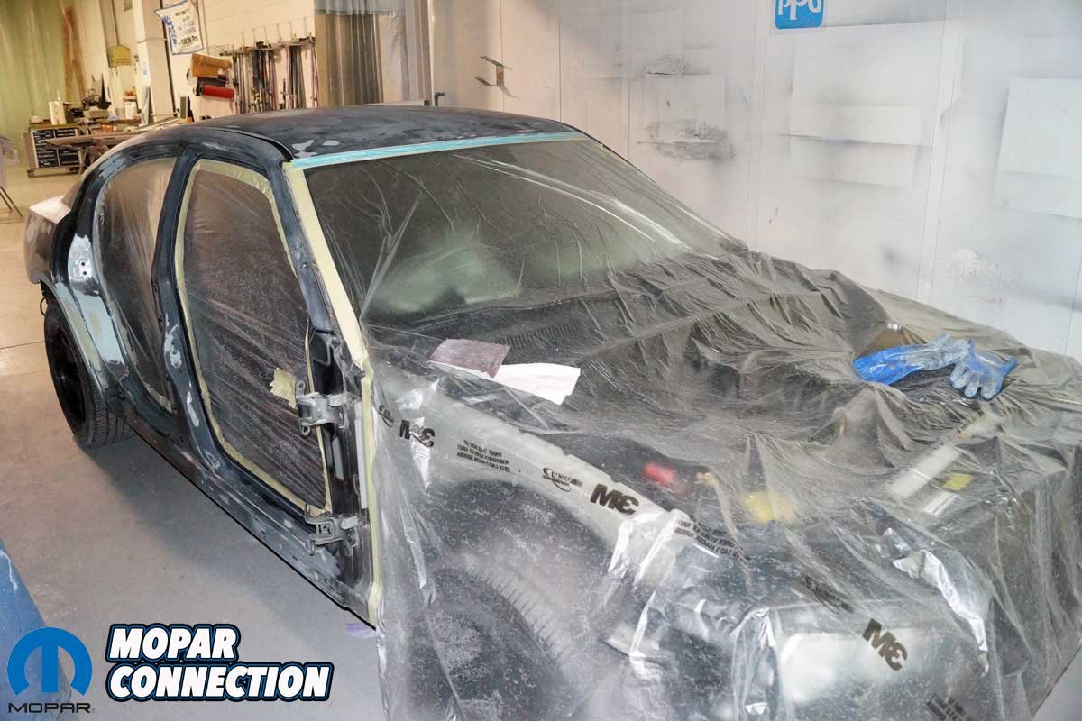 As the sealer primer application continued, the Charger’s chassis was cleaned and prepared for its turn in one of the prep booths. When a booth opened, the chassis was rolled in, and the interior, trunk area, and front of the car were taped. The entire vehicle was scuffed with a Scotch Brite pad to ensure enough “tooth” (mechanical adhesion) for the primer to adhere cleanly.