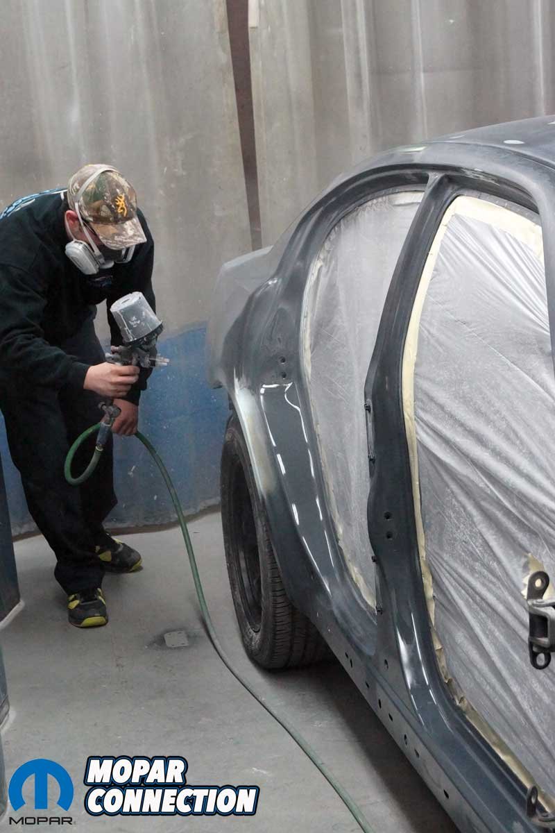 The students blew off all the Charger’s body panels with compressed air and treated the surface with a prep solvent to clean it before applying the DuPont sealer primer. With the paint gun loaded with primer, two medium coats were laid down, providing sufficient coverage. The primer was left to dry in the 75˚F prep booth. The two medium coats of primer supplied a thickness of about 2.0-2.2 mils.