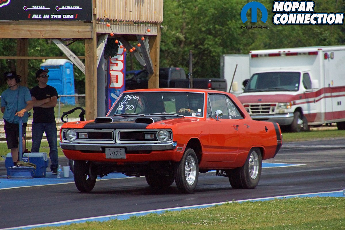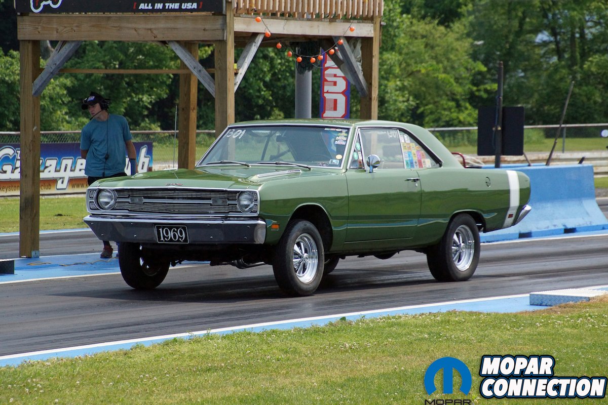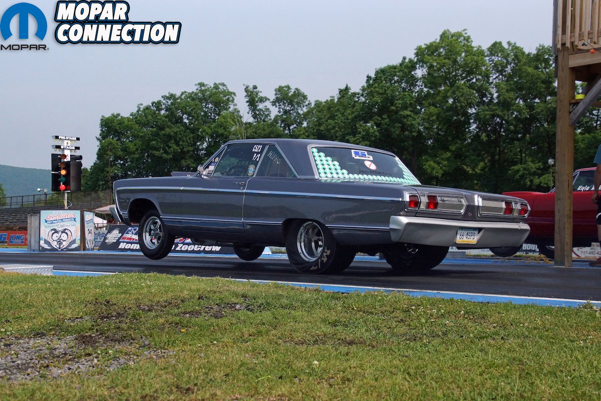 The second day of the Mopar or No Car Nationals was race day; there were four racing classes. There was quick eight (Pro Mopar) anchored for the second year in a row by Tim Rigglemen, who ran 7.92 elapsed time in qualifying in his small-block 1991 Daytona. The fast Mopars that did not make the cut for the quick eight class competed in the Hi-Po Mopar class, which was packed full of cars and trucks running 11.99 seconds and faster. An ever-growing group of late-model Challengers and Chargers competed in Modern Mopar, which included all Mopars from 1992 to date. The largest class was Cool Street, which consisted of 12 second and slower Mopars.