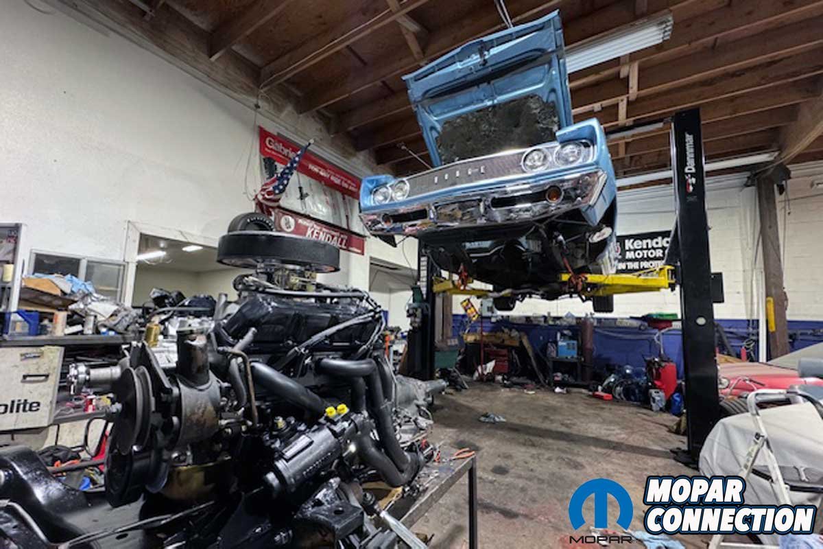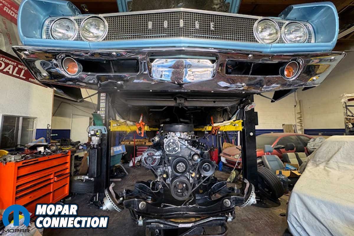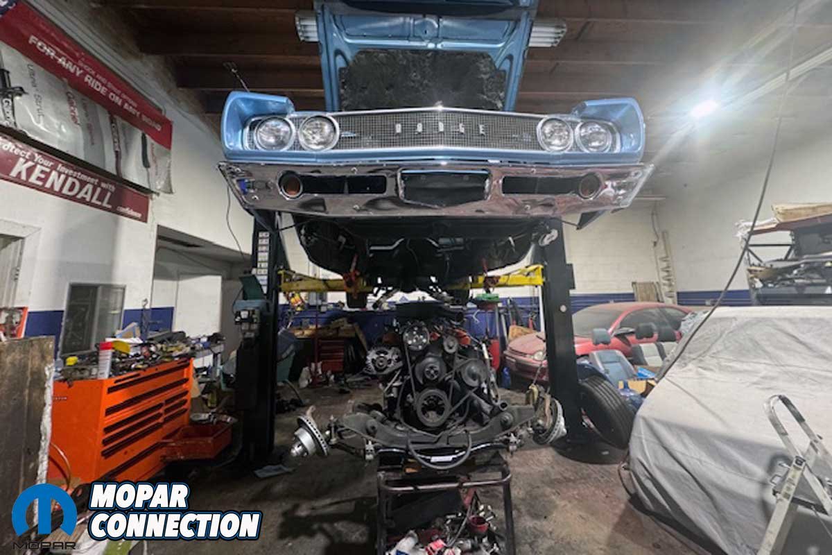 Above Left: We took the Coronet to Fontana Motorsports to handle the engine swap. Above Right: Just like the factory, the techs at Fontana Motorsports removed the 318 from the underside of the chassis.