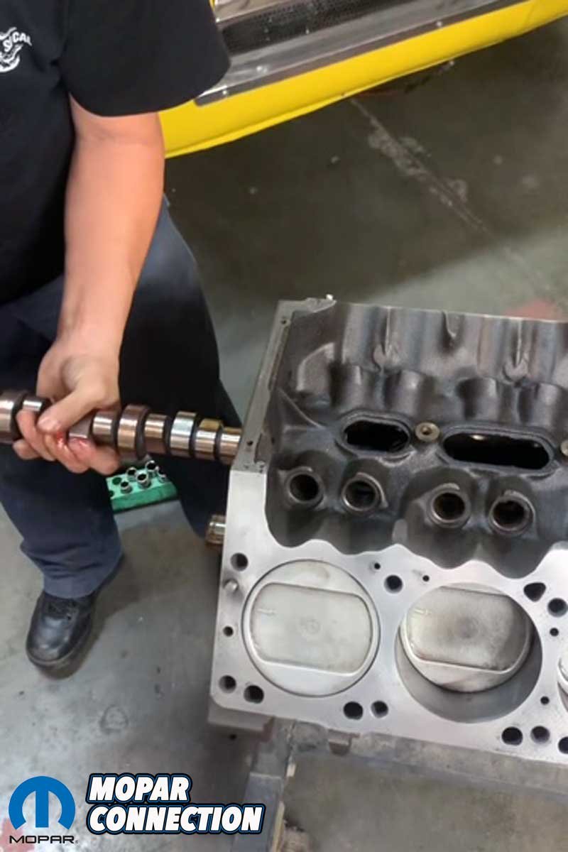 Above Left: The roller camshaft was carefully installed into the Magnum block. Above Right: The camshaft was installed straight up. The Comp Cams double roller timing chain kept everything adequately timed.