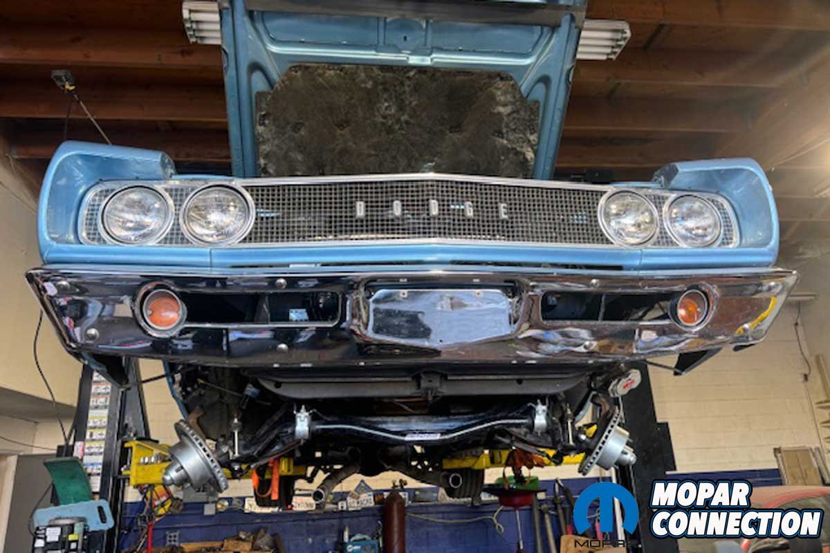 Fontana dropped the Coronet’s engine and K-member from the chassis, a common way to swap on Mopars. While the K-member was out of the car, we swapped the steering box for a Borgeson unit (PT# 800126) with its associated U-joint kit (PT# 036425). The steering box is substantially smaller than the factory unit, which provides additional room for headers. The steering ratio is 14:1, making an old Mopar steer like a modern vehicle.