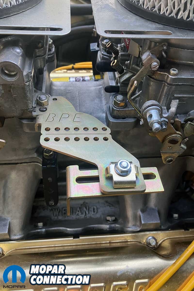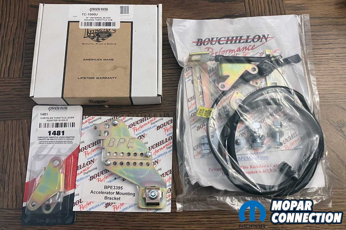 Above: Due to the tunnel ram added to our small block in our ’73 Charger, we needed to pick up a kickdown cable kit, a throttle cable, and several brackets to reestablish the proper kickdown operation of the Torqueflite transmission. Mancini Racing had everything we needed to complete the upgrade.