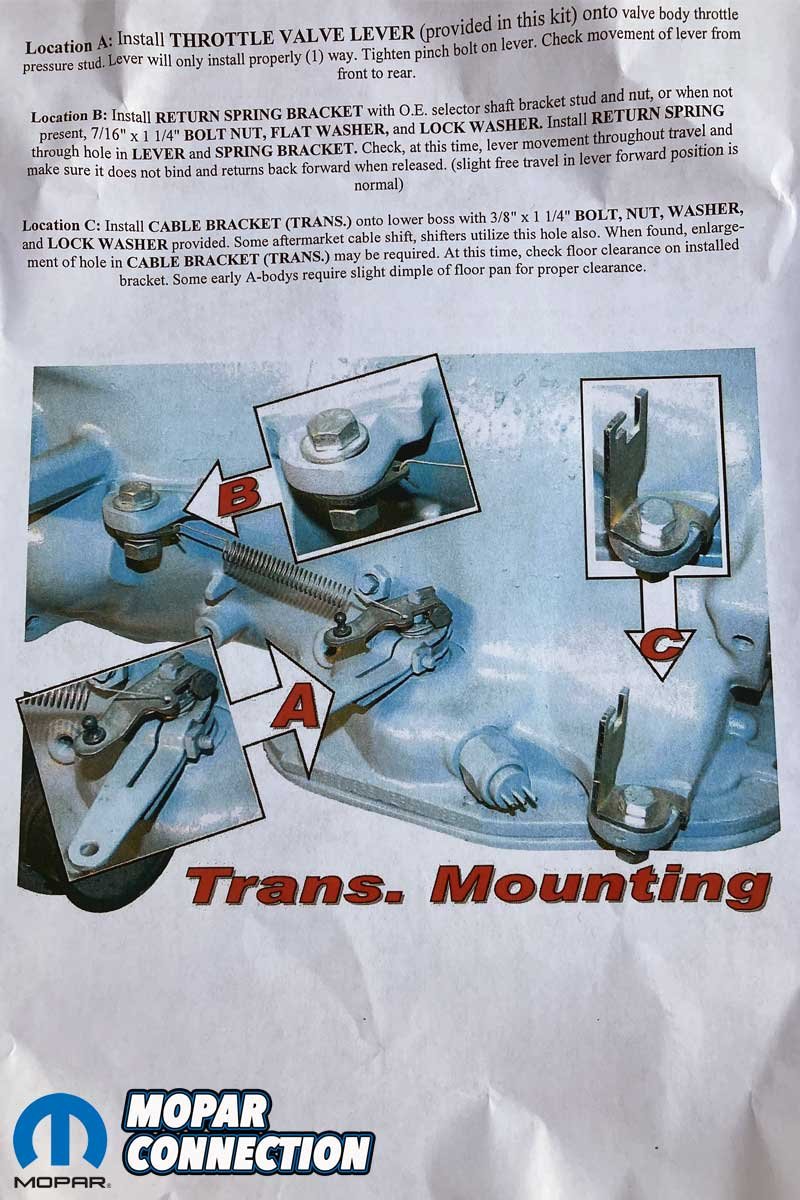 We picked up a Mancini Racing Kickdown Cable Kit to rectify the concern. The cable kit will satisfactorily unite any carburetor or throttle body to the transmission throttle lever, which will help maintain the proper throttle valve (TV) pressure. Adequate TV pressure permits correct shifting points and provides clutch and band friction material longevity.