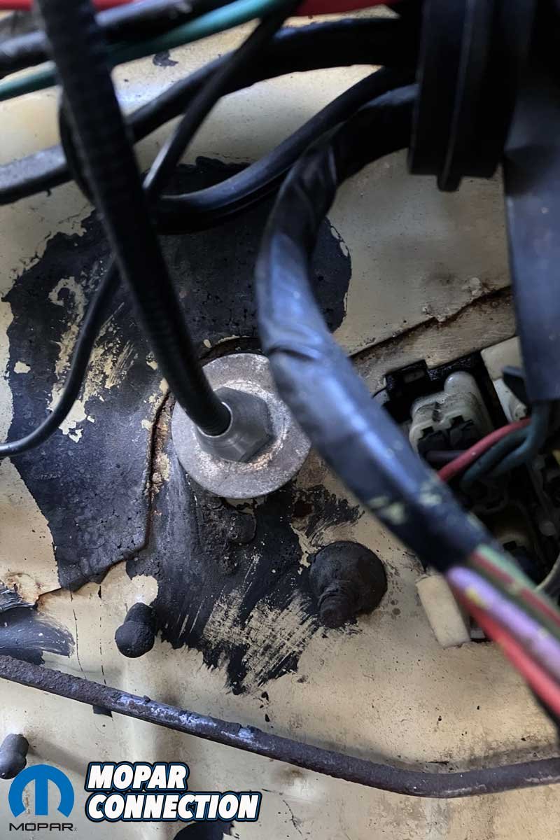 Upon completion of the installation on the car’s underside, we ran the cable along the top of the transmission, resting it on the engine. Next, we installed the new 24-inch Lokar Throttle Cable from Mancini Racing. After unscrewing the retaining nuts on the pedal side of the throttle cable, we discarded the end of the cable. We removed the old throttle cable and slipped the new cable through the firewall at the factory location. We secured the cable with the supplied nuts, a large washer, and a homemade rubber gasket.