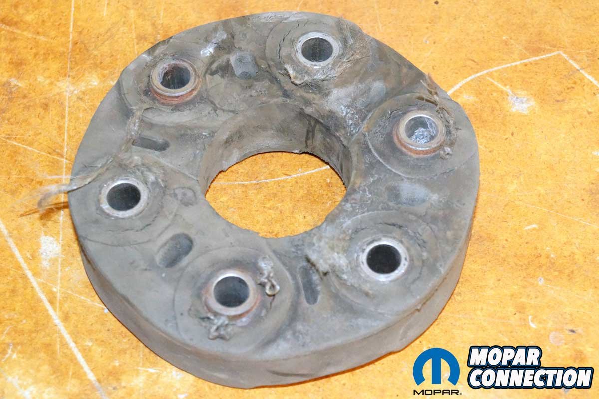 Above Left: The coupler (rear in this case) was pulled after six fasteners were removed. There were several cracks and areas where the inner wound fabric broke through the rubber insulator. Above Right: The new coupler purchased from RockAuto matched the factory unit perfectly. The front and rear couplers on the Charger are the same part number, so I ordered two. After installing the couplers, the Charger rode quietly and smoothly without any hint of vibration.