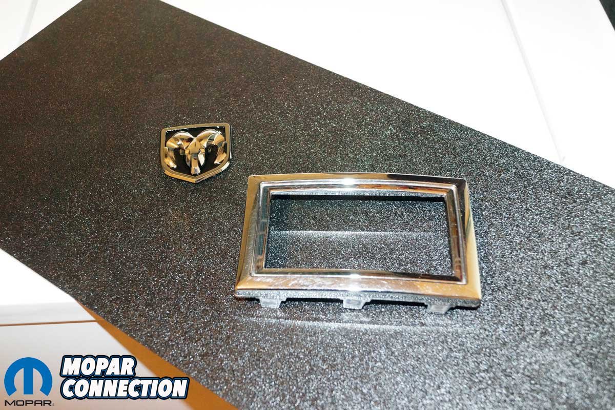 Above Left: To fill the void in the center console where the shifter would be on a civilian Charger, I picked up black textured plastic, a factory bezel, and a Ram Head emblem with a self-adhesive backing. Above Center: I trimmed the plastic to fit in the bezel. After removing the chrome from the back side of the bezel, I glued the plastic to the bezel. I carefully affixed the emblem to the bezel assembly with the self-adhesive backer removed. Above Right: I test fitted the delete plate, and it fit perfectly.