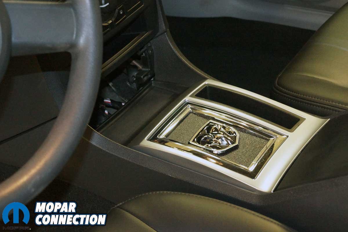 The chrome bezel around the selector hole in the console was removed, and the chrome on the backside was sanded off so epoxy would adhere. The epoxy was applied to the bezel, and the textured plastic was pressed to it. To finish the bezel, I affixed a properly sized chromed Ram Head emblem to the textured plastic. The Ram Head on the console matched the emblem on the Charger’s front bumper cover. With the delete plate installed, it looked like a factory installation that was clean and understated.