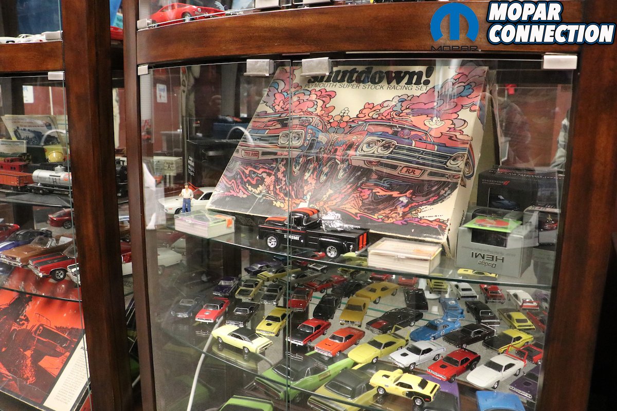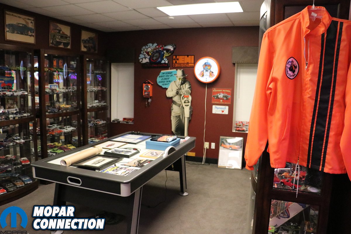 Short, broad shouldered and thrumming with the energy of a man a third his age, Mike Gemza’s passion for Mopar muscle cars is almost fanatical. “Here! Let me show you our ‘Man Cave!'” he boomed, leading our small tour into a ochre-red room lined with glass cases, neon signs, advertisements and other memorabilia.