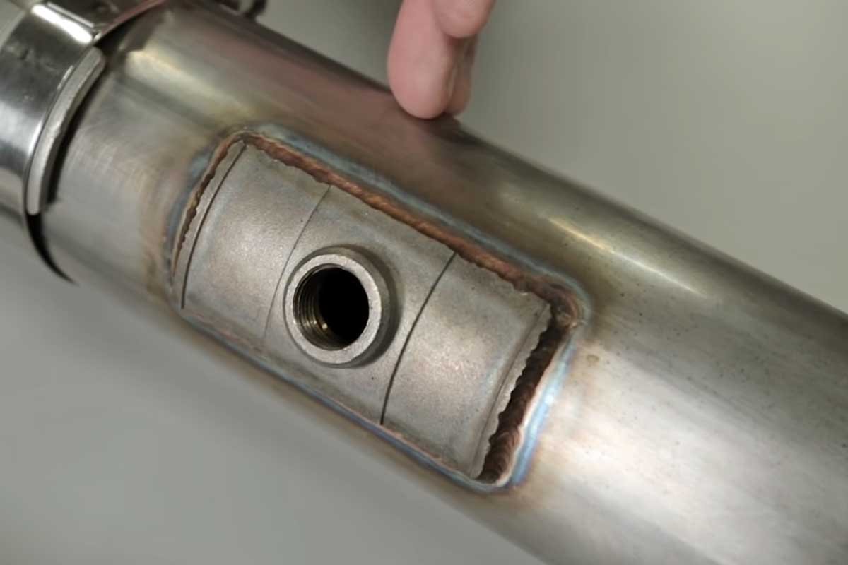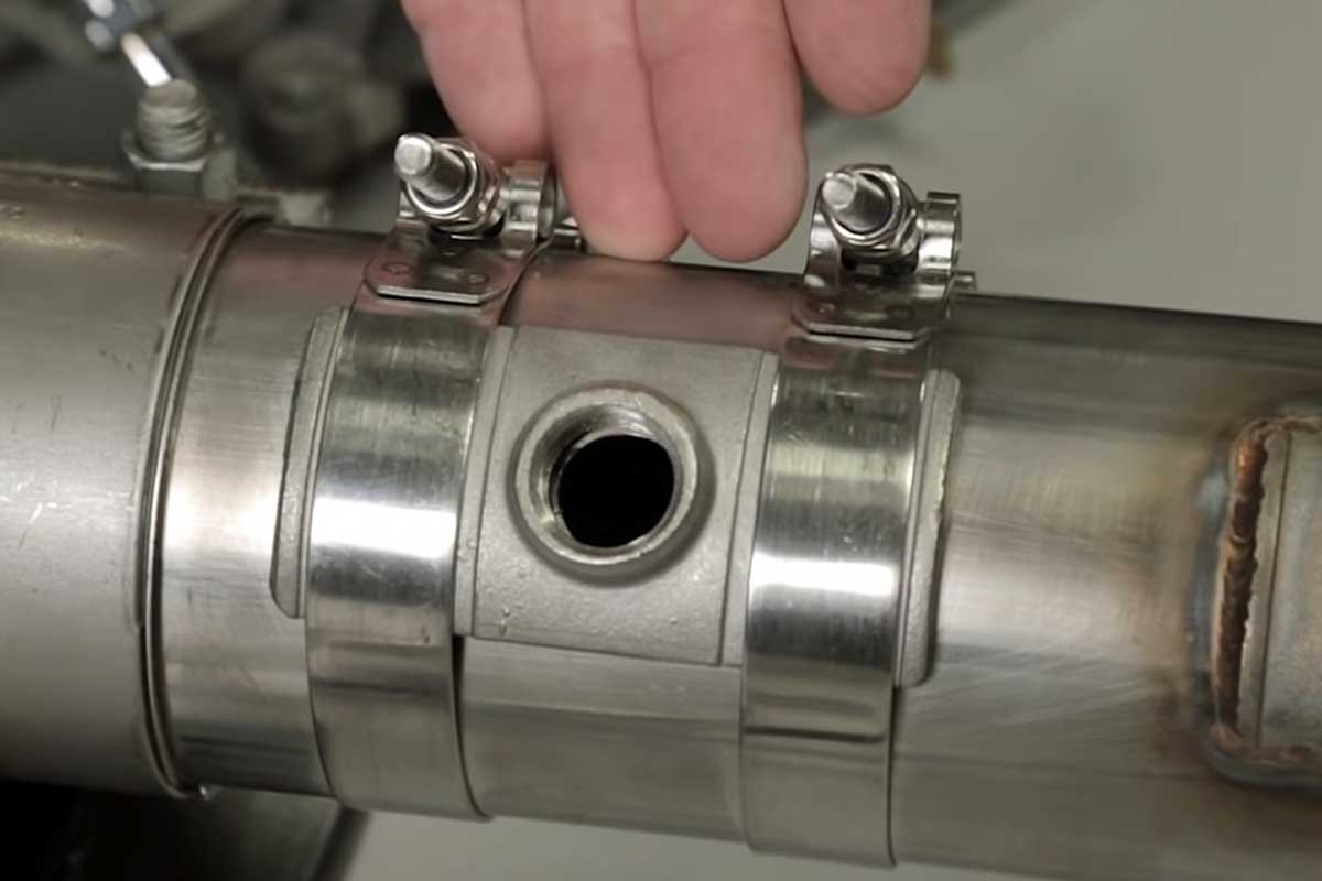 With the hole drilled, we slipped the supplied gasket over the hole. Next, the stainless-steel bung was placed over the gasket. Subsequently, t-bolt clamps were situated over the exhaust pipe and onto the bung. Once everything was lined up, we tightened the T-bolts. Our last step was threading the UEGO sensor into the bung and routing the wiring away from hot or sharp components.