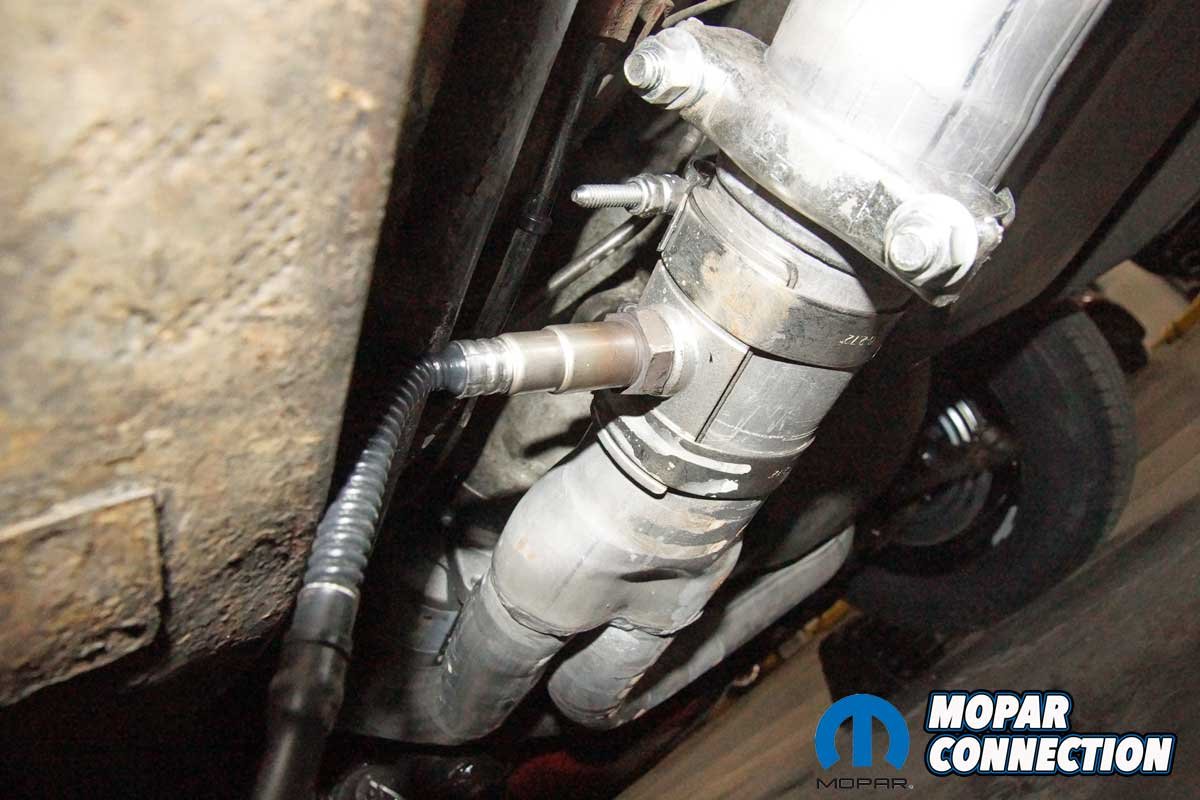 Because our 273 equipped Dart had a single exhaust, we decided to install the Bosch UEGO sensor after the merge point of the two header pipes. We drilled a ¾-inch hole at a 10° angle above level (sensor pointing down into the exhaust) to mount the bung. The UEGO sensor must stay at the upper portion of the exhaust tube, so contamination will not result.