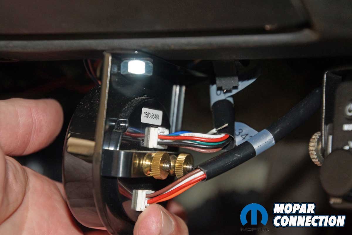 We picked up a 2 1/16-inch aluminum gauge panel to mount the gauge. We mounted the panel on the lower dash lip. The gauge was secured to the panel with the supplied hardware. Both connectors were attached to the back of the gauge.