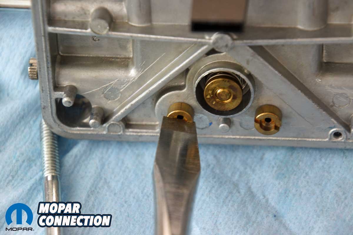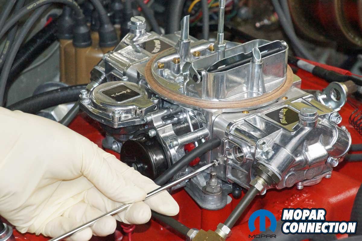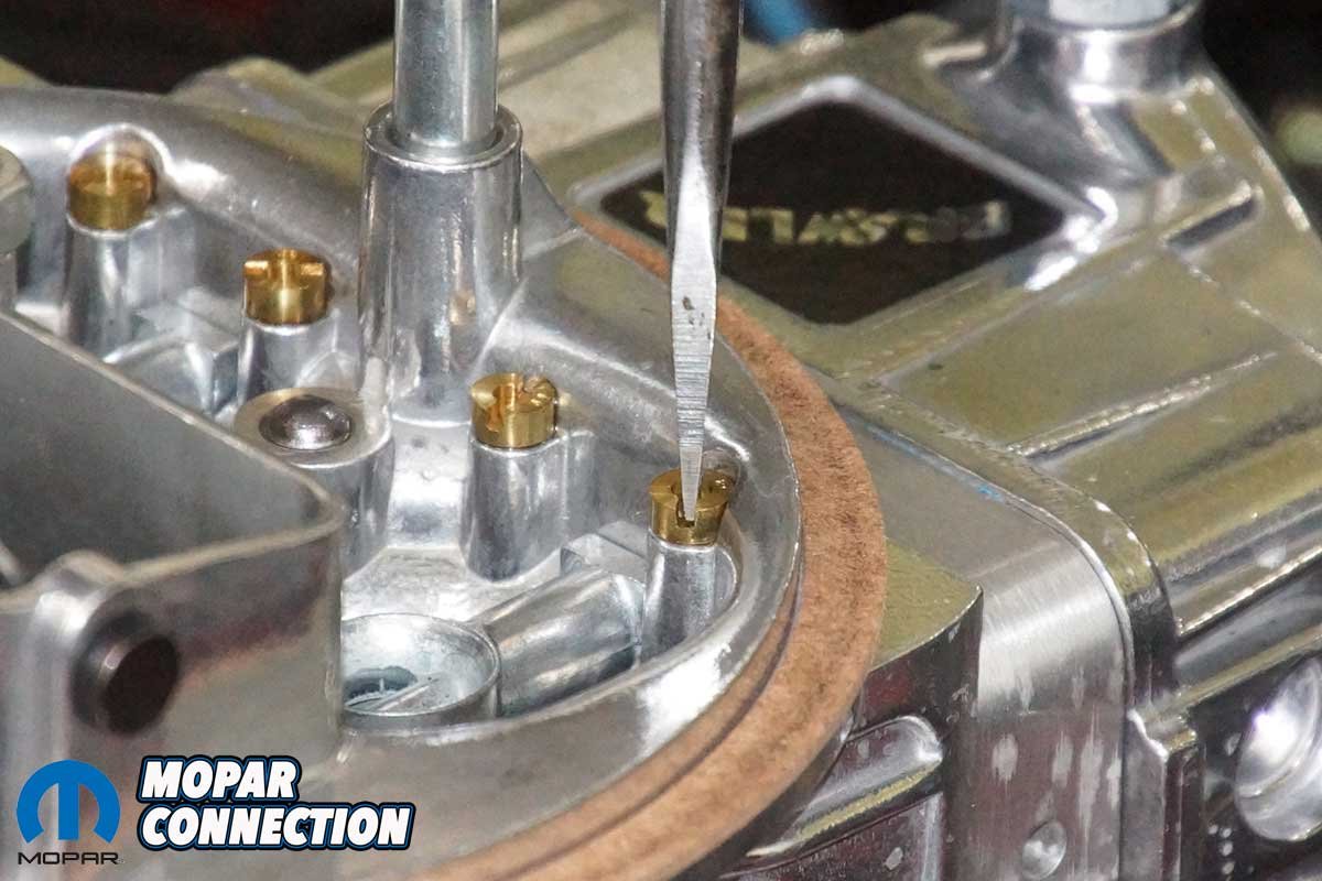 Left: We fine-tuned a slight off-idle hesitation with a larger accelerator discharge nozzle (squirter). Right: We also fine-tuned the vacuum secondary opening with a minor turn of the adjustment screw.