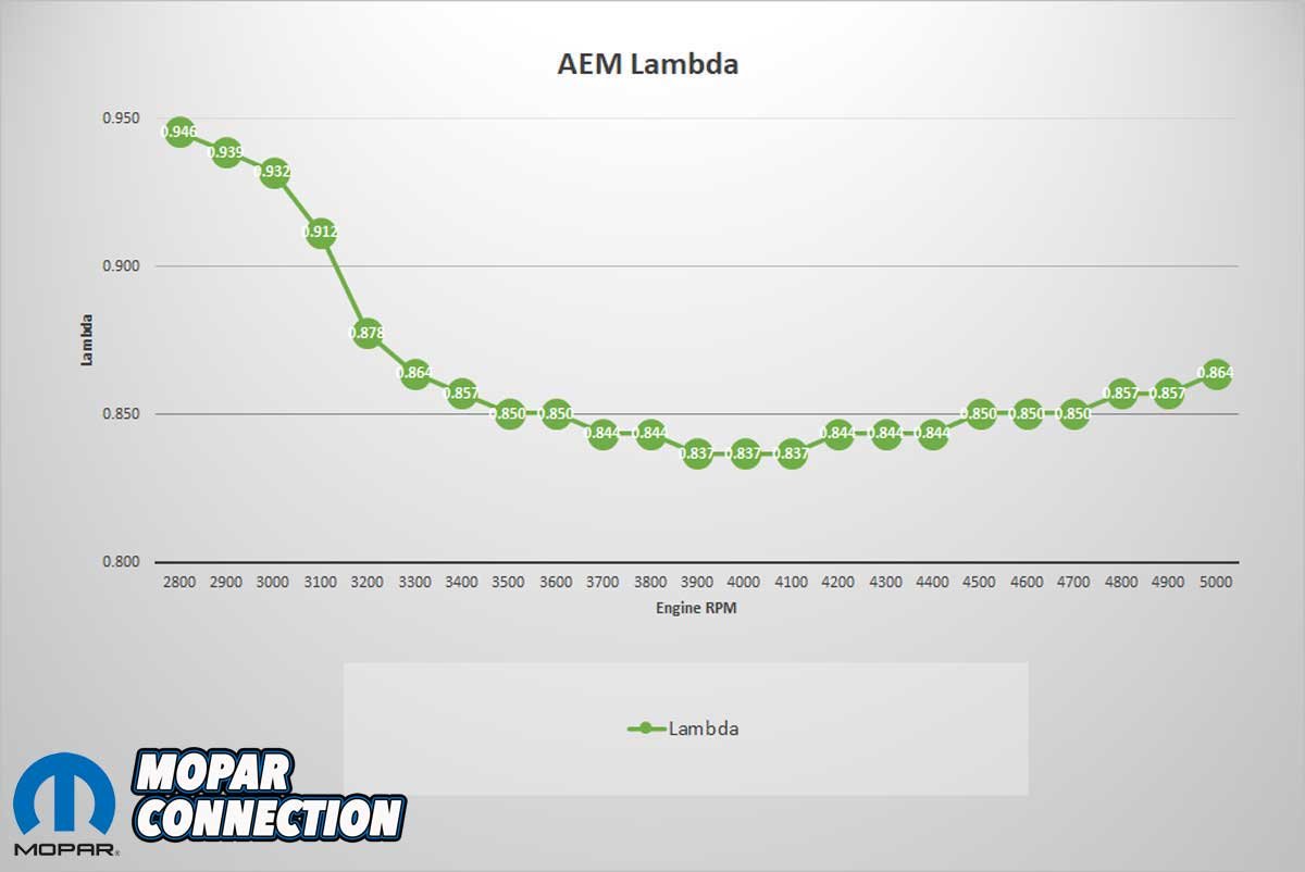 We preconditioned the Dart (tied down and warmed the engine and drivetrain) and made a wide-open throttle (WOT) run from 2800-5000 rpm. The AEM and the Mustang dyno UEGOs showed a lean condition (for power) through the entire power curve.
