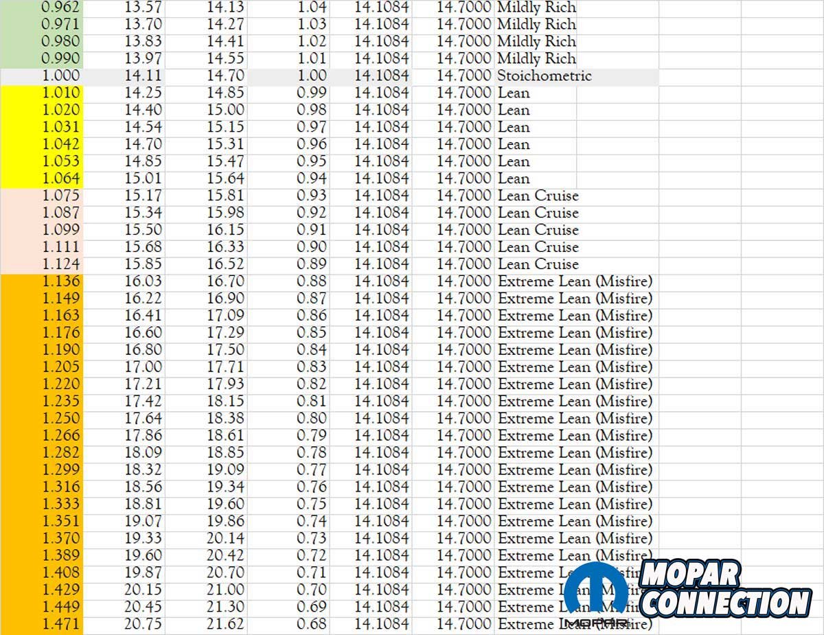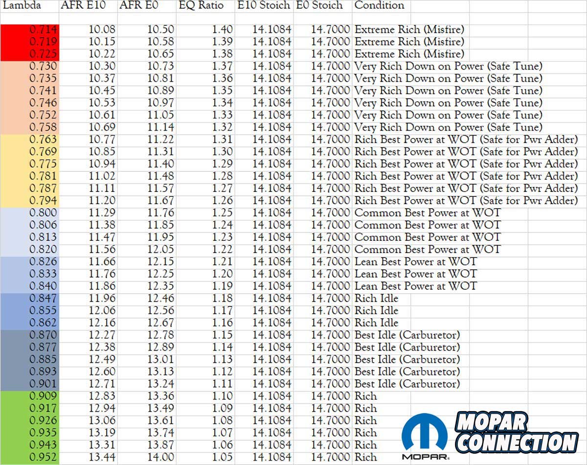 Above: The above chart provides a reasonably accurate relationship between lambda and E10 or E0 air-fuel ratios. The color codes and the conditions may need to be slightly tweaked for each engine, but it is a decent starting point.