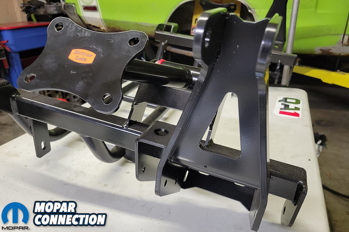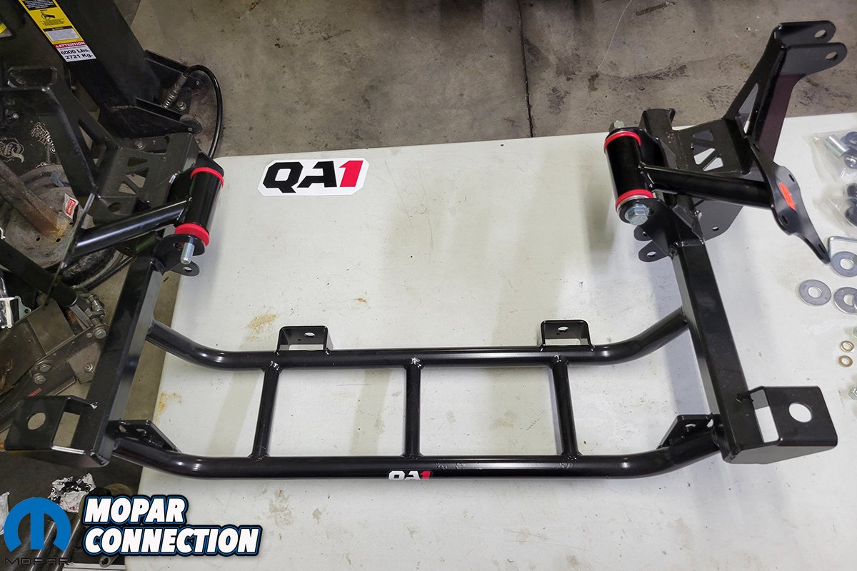 The k-member is built well and similar to the torsion bar k-member. The new QA1 coil-over k-member has welded-on brackets for the lower control arms and the coil over shocks bolt to. We choose the the mounts for a Gen III Hemi. They also have options for big block, small block and Gen II Hemi. The engine mounts are attached with polyurethane bushings.