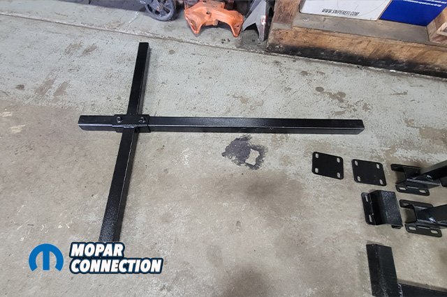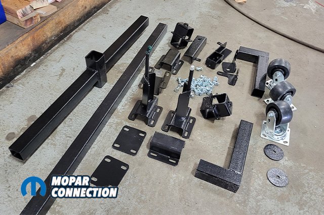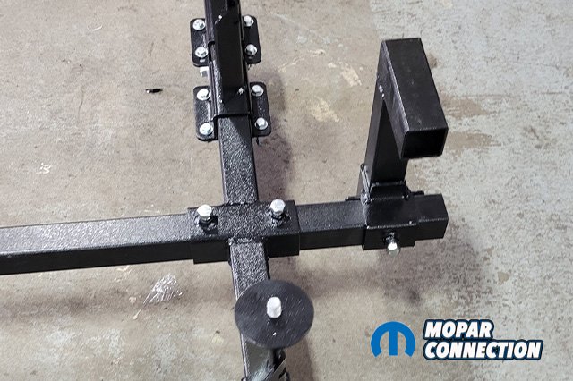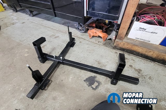 USCT’s Mopar K-frame stand (USCT7M2081) fits all A-B-E bodies. Adjustable for all engines and transmissions, from Slant 6, small block, and big blocks to Hemis. No more paint scratches or chipped paint while removing panels just to remove the motor! There is some light assembly required after you receive the kit. After we had it assembled, we lined up the pins with our K-member.