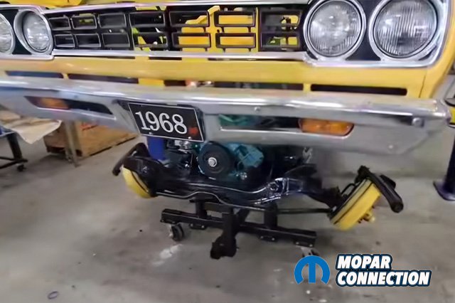 When Chrysler originally installed the drivetrain in the Mopar, they slid the power plant in from the bottom already bolted on to the K-member. So sometimes when people remove the engines, they’ll lift them out of the top or we’ve even seen some people drop the K-member and all out of the bottom right onto the ground.