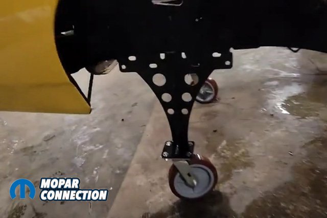 Above left: Shows the body stands with a heavy duty 8″ ball bearing caster wheel. CNC cut from heavy gauge steel with mounting holes available for bumper mounts or under side of uni body. Above right: We mounted the body stand to the under side of the frame rails to support the weight of the car.