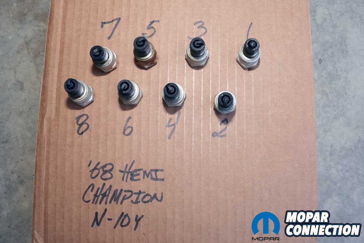 The other seven plugs were just as tight, but we removed each damage-free. The plugs were Champion N-10Y spark plugs, which were correct for the Hemi. Interestingly, the plugs were manufactured in the USA, which corresponds with the story we were told about the tune-up being performed in the 1980s. Champion started manufacturing plugs in Mexico beginning in the 1990s.