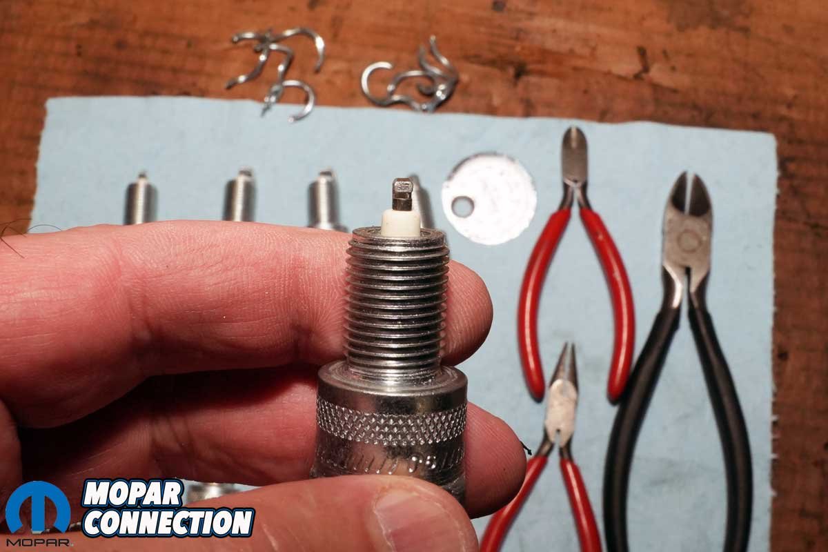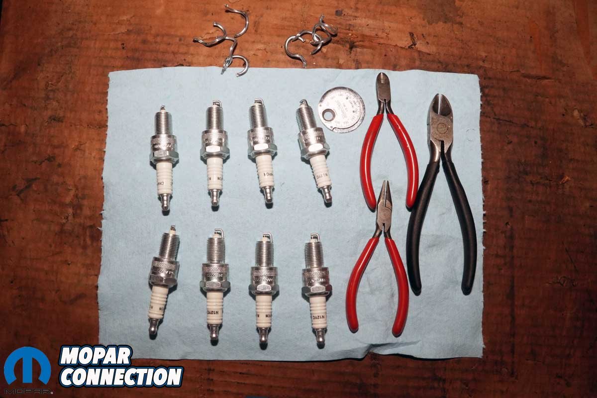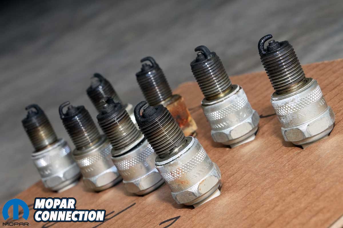 Above: We removed the washers from our new Champion spark plugs. Each plug’s side electrode was centered and then the gap was set to factory specs. Because Mopar used Champion plugs for decades, we selected a set of N-12Y plugs. Based on the carbon fouling of the old N-10Y plugs, we selected a slightly hotter plug to reduce carbon build up.