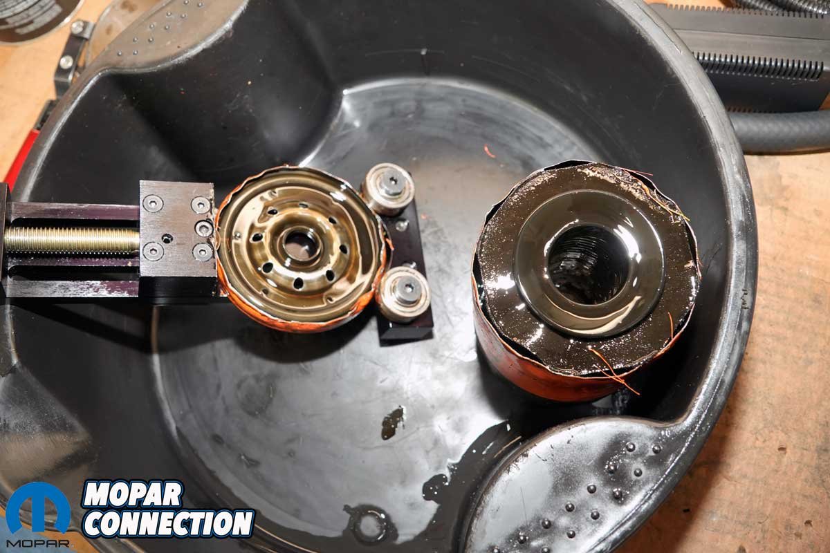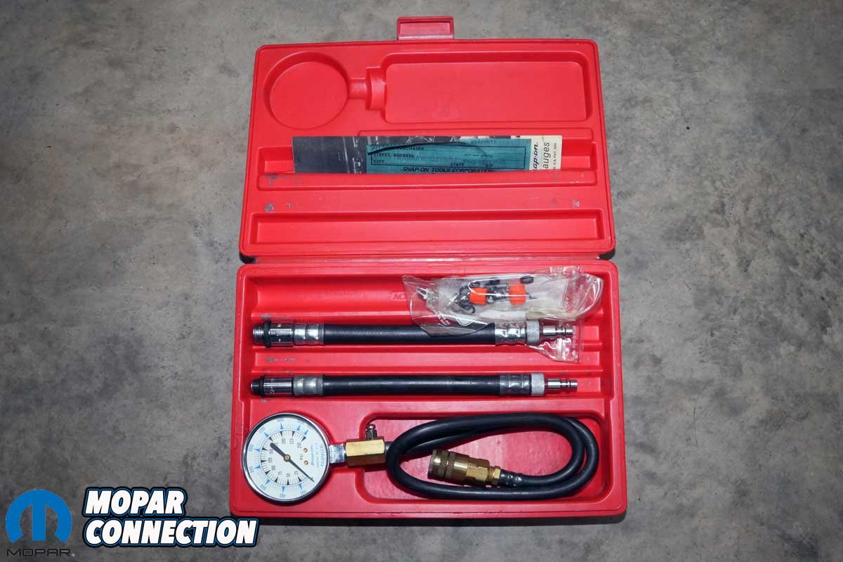 We noted the first and last pressure readings. The compression PSIg specs for our 10.25:1 compression ratio Hemi were 150-205 PSIg, with a maximum variation of 30 PSIg. After running through all eight cylinders, the compression numbers were between 185 and 205 PSIg. The variation between the lowest and highest cylinders fell into spec. The first puff, which provides information about the piston ring integrity, ranged from 115 to 135 PSIg.