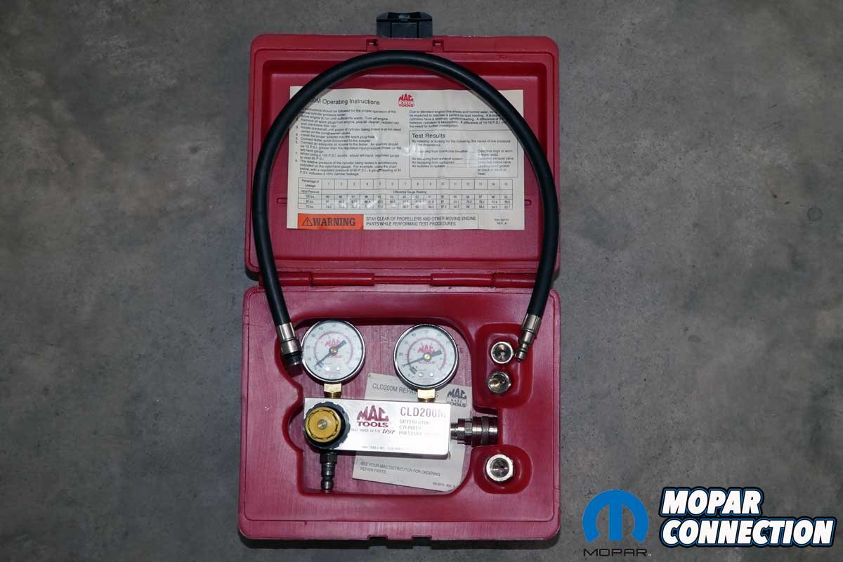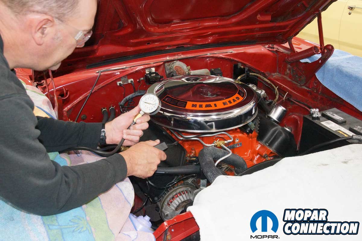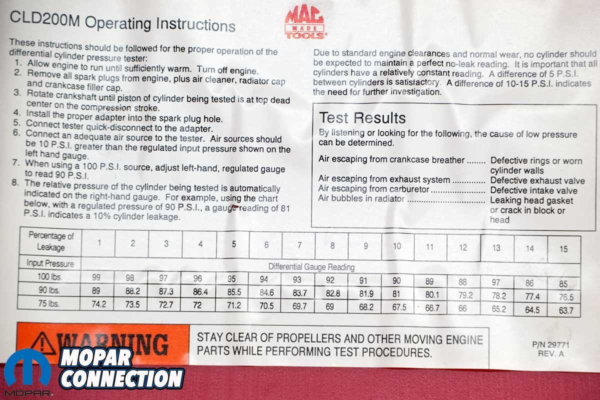 When the tester was connected, we noted the engine leakage at TDC. The leakage percentages on our 57-year-old engine were phenomenal. Only two cylinders had a 6% leakage, while all the rest had 5% or less. The leakage ranged between 2 and 6%. Based on the compression and leak-down tests, the Hemi appeared quite solid.