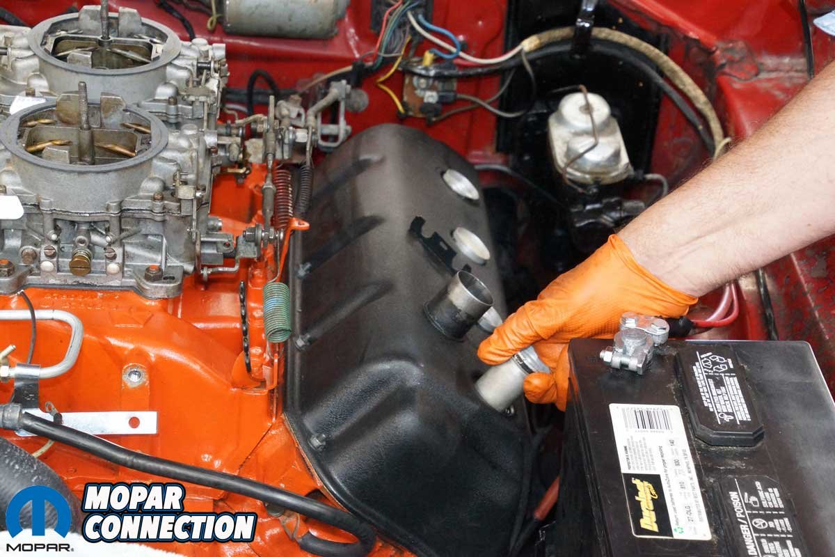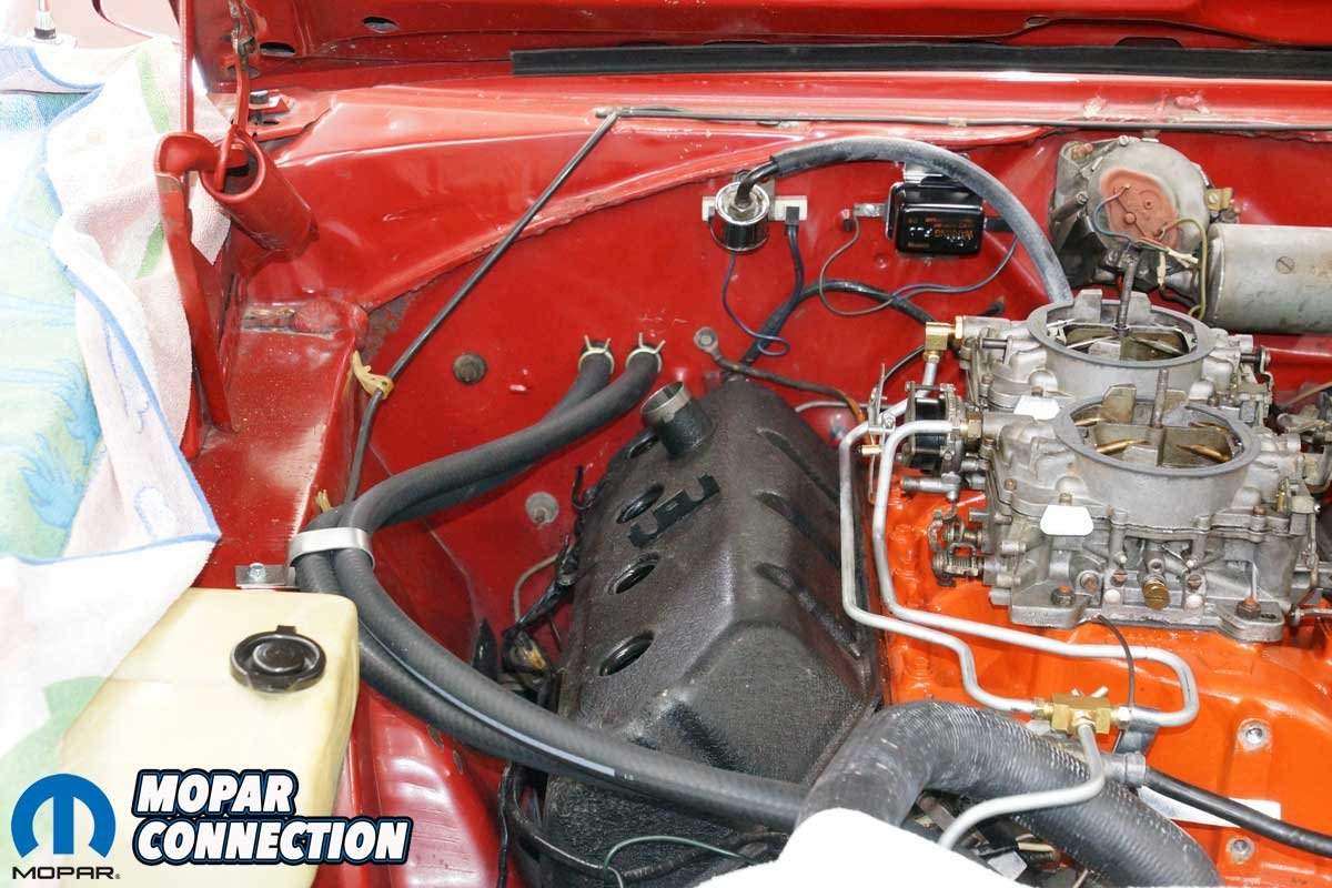 Above: After spinning on a new oil filter and adding fresh oil, we moved to additional tests of the Hemi. We needed a way to turn over the engine to perform the tests. We have a remote starter button that we attached a lead to the 12-volt post of the starter relay. The other lead was attached to the “S” terminal of the relay after we disconnected the yellow wire. When the button was depressed (squeezed), it connected 12 volts to the “S” terminal, which energized the starter.