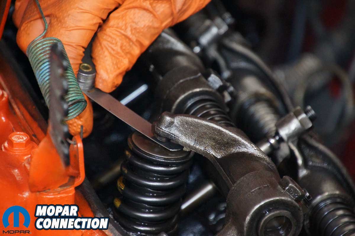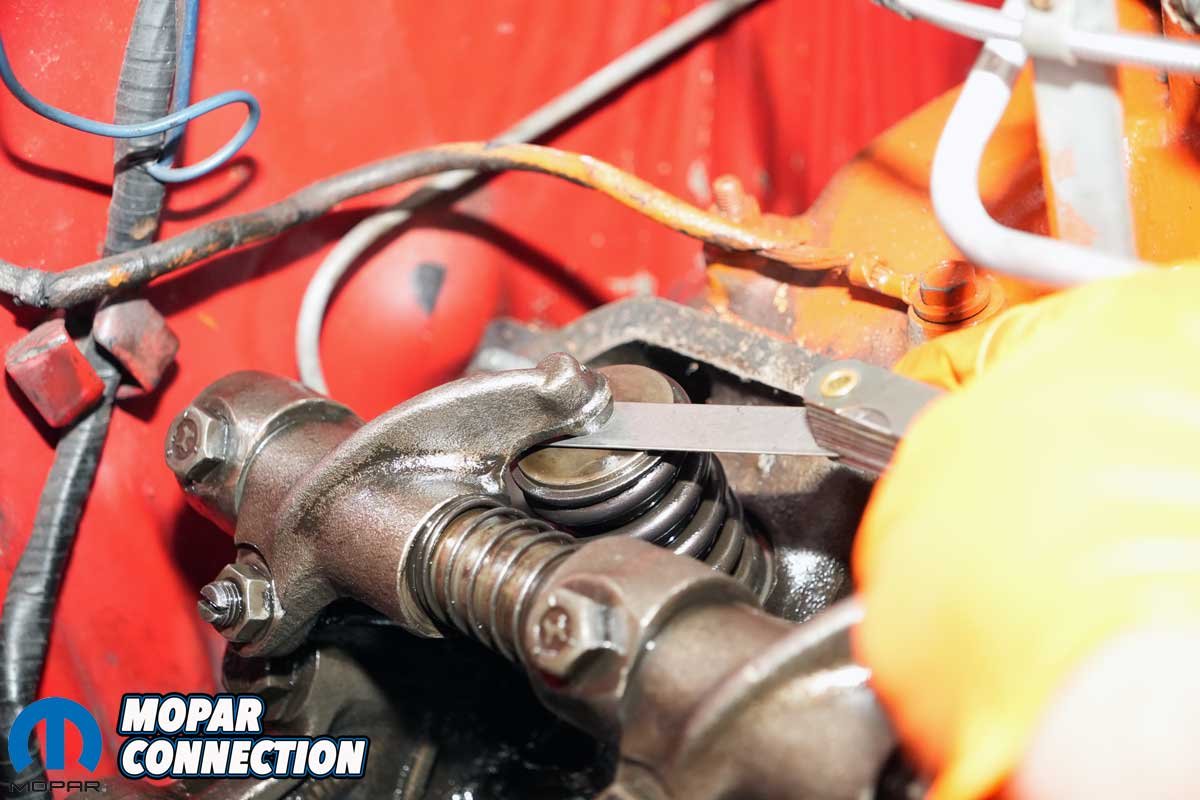 To measure the exhaust lash on cylinder #2, we rotated the engine until the intake rocker arm was about two-thirds closed. Again, the lash was slightly loose (exhaust spec—0.032-inch cold), but on only three of the four rockers. After adjusting the lash, we spun over the engine and rechecked it.