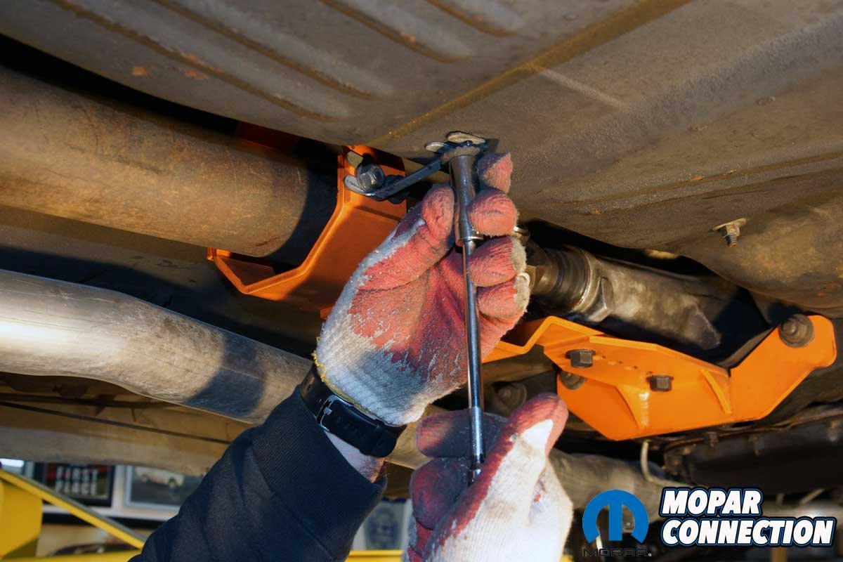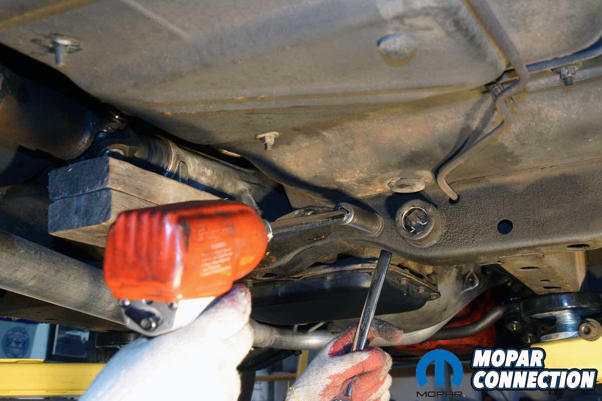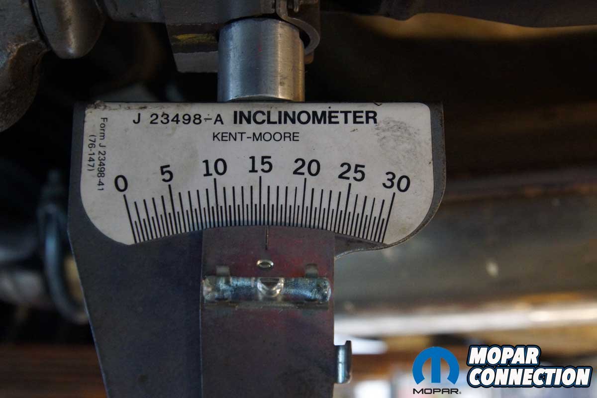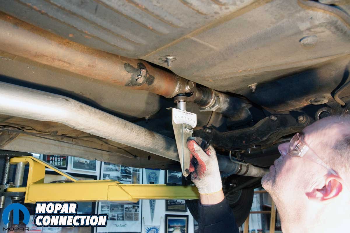 Before we lowered the Dart, we supported the rear-end housing with jack stands and rechecked the driveshaft angles. Although there was a slight change in the slip yoke angle, we determined the working angle at the transmission had changed by less than 0.5° from its previous measurement. The difference was minor, so we did not feel an adjustment was necessary. Finally, we reinstalled the last cross-member bolts and remounted the driveshaft loop. Lastly, we torqued the transmission bolts and all four cross-member fasteners.
