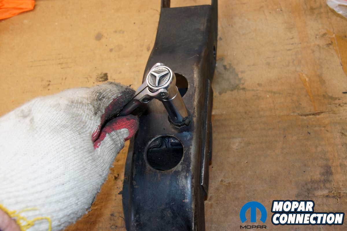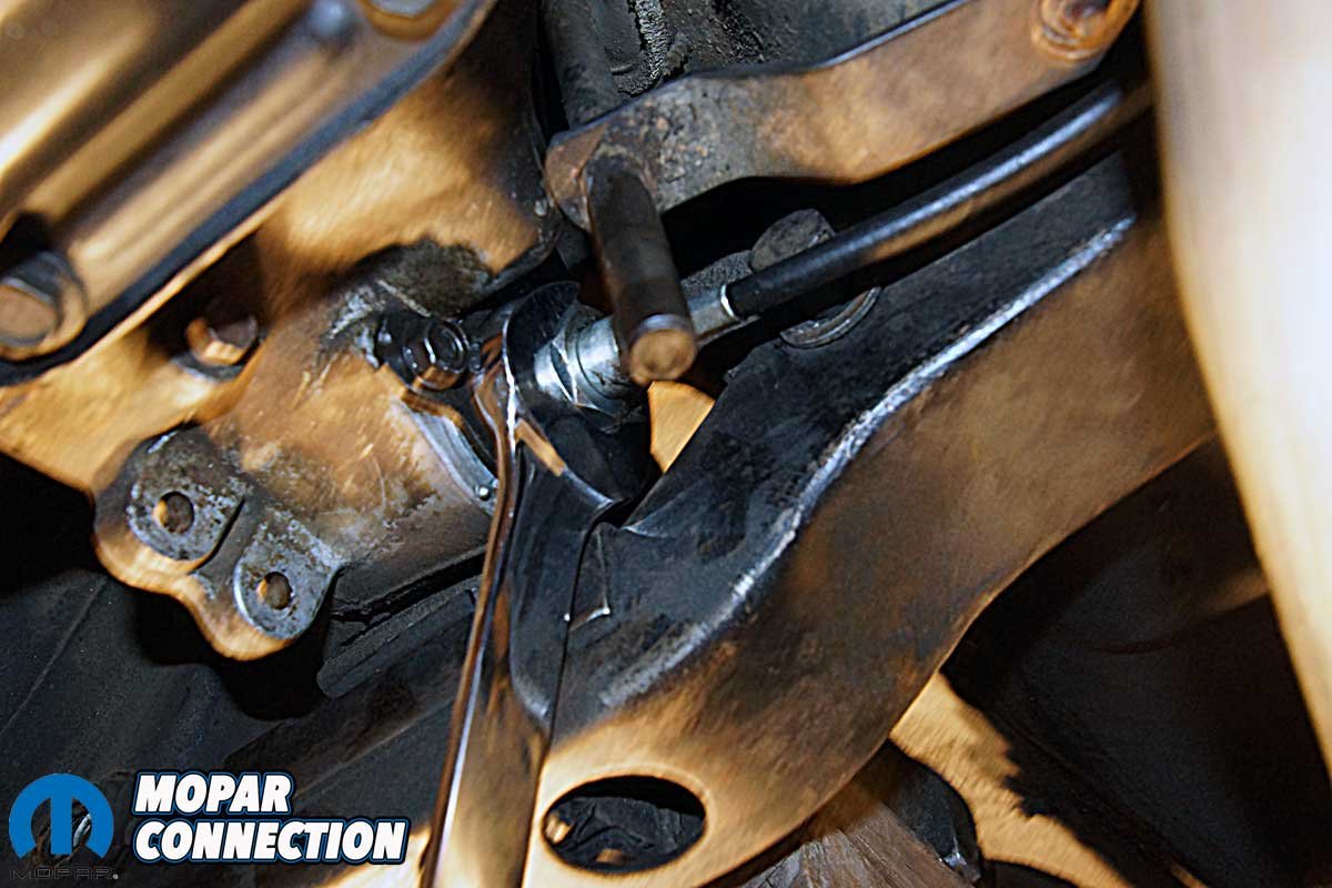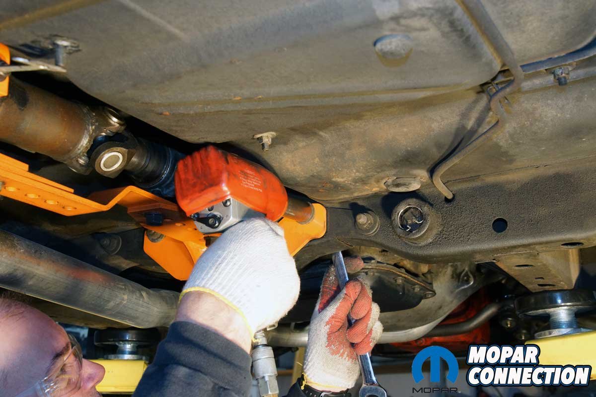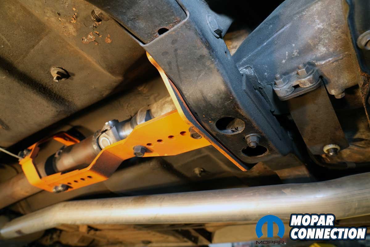 Before we lowered the Dart, we supported the rear-end housing with jack stands and rechecked the driveshaft angles. Although there was a slight change in the slip yoke angle, we determined the working angle at the transmission had changed by less than 0.5° from its previous measurement. The difference was minor, so we did not feel an adjustment was necessary. Finally, we reinstalled the last cross-member bolts and remounted the driveshaft loop. Lastly, we torqued the transmission bolts and all four cross-member fasteners.