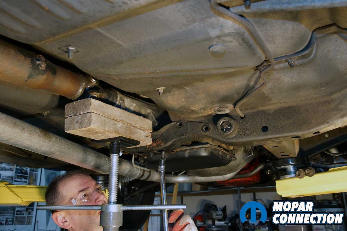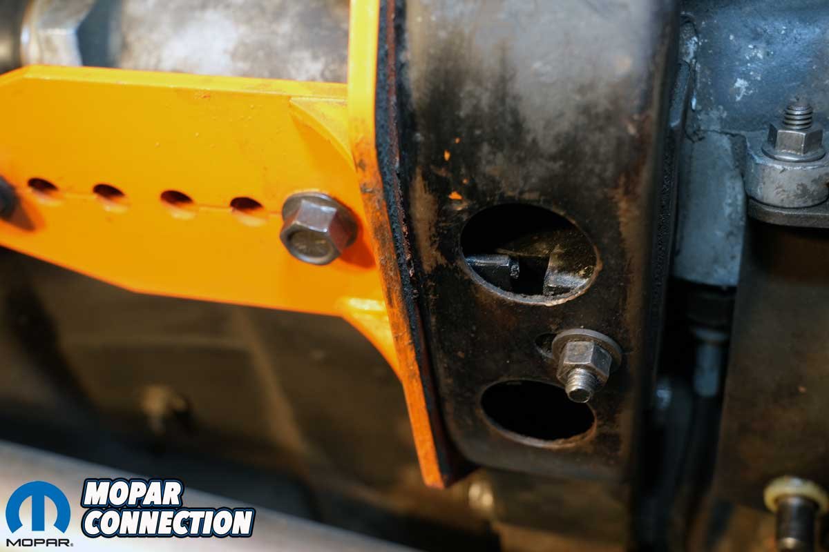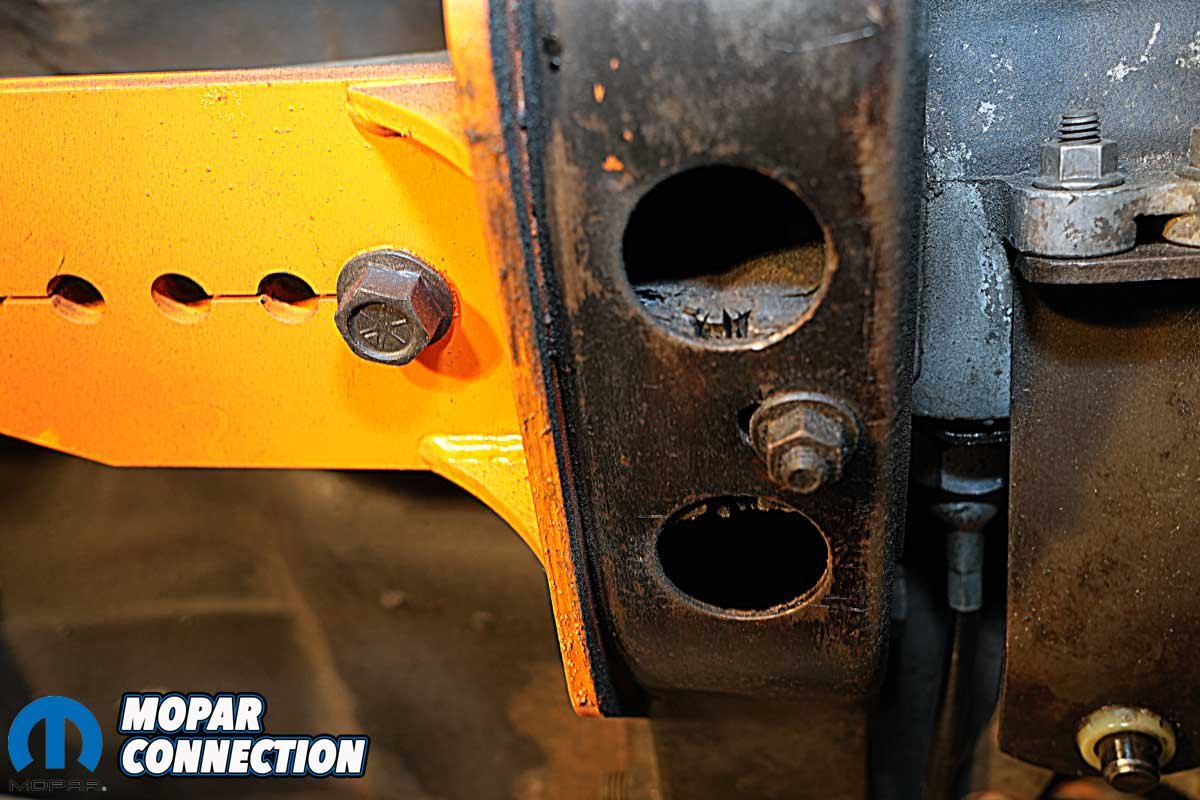 We contacted YearOne about a new transmission mount. YearOne had the factory-style rubber transmission mount we needed (part no. FD33145). The transmission mount fits all 1965-1973 A-body automatic and manual transmission models and 1962-1971 B-Body Chargers, Road Runners, and Super Bees with automatic and manual transmissions.