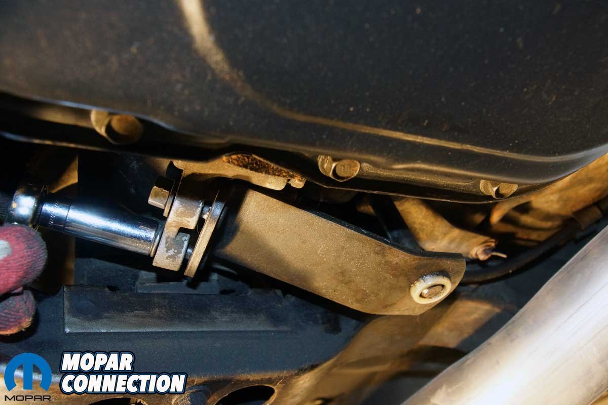 The YearOne mount dropped into place in the cross member. We reattached the fastener to the new mount. The cross member was repositioned in the chassis, and the outer bolts were installed. We installed both transmission bolts through the mount and into the transmission, and then we removed the jack stand.