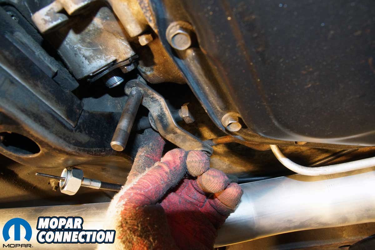 Above Left: With the shifter in 1st gear, the shaft and lever swung around just enough to clear the remaining cross-member bolt. Above Right: With the last bolt removed, the cross member slipped away from the chassis.