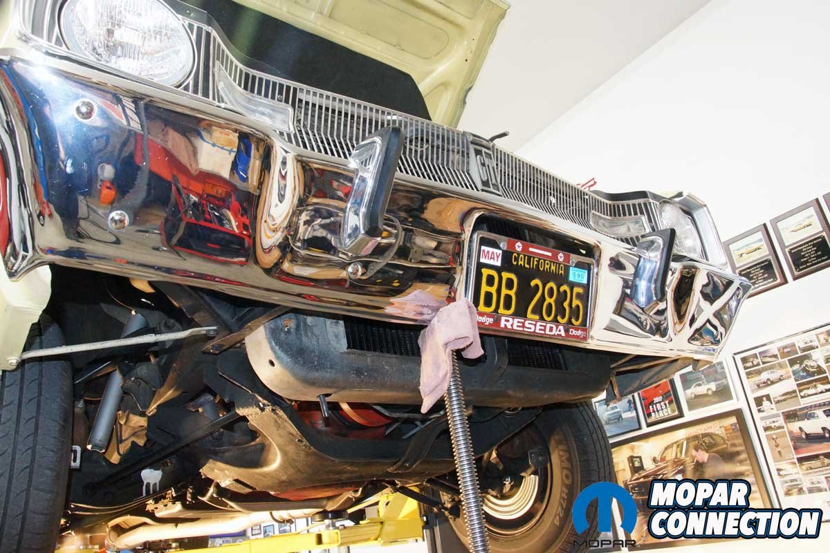 Above: To check the driveline angles, we had to support the weight of the Dart’s rear on a pair of jack stands. To ensure the Dart did not flip off the vehicle hoist, we added a jack stand to support the front of the Dart.