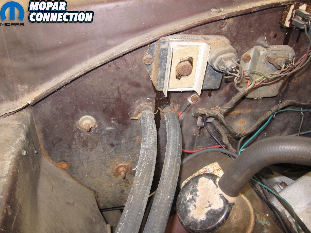 Under the hood, we started at the firewall and worked our way forward. The new evaporator required a bolster plate for maximum rigidity, so we cleared space by removing the ignition ECU, voltage regulator, ballast resistor, and engine ground wire. With the space clean and clear, it was time for a test fit of the reinforcement plate. Unsurprisingly, every pre-cut hole lined up with its corresponding partner on the original firewall. We marked and drilled four new holes for mounting, then continued forward.