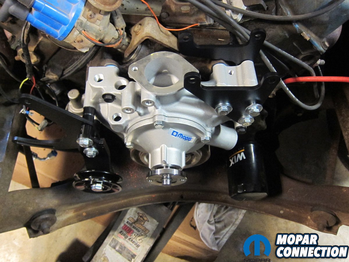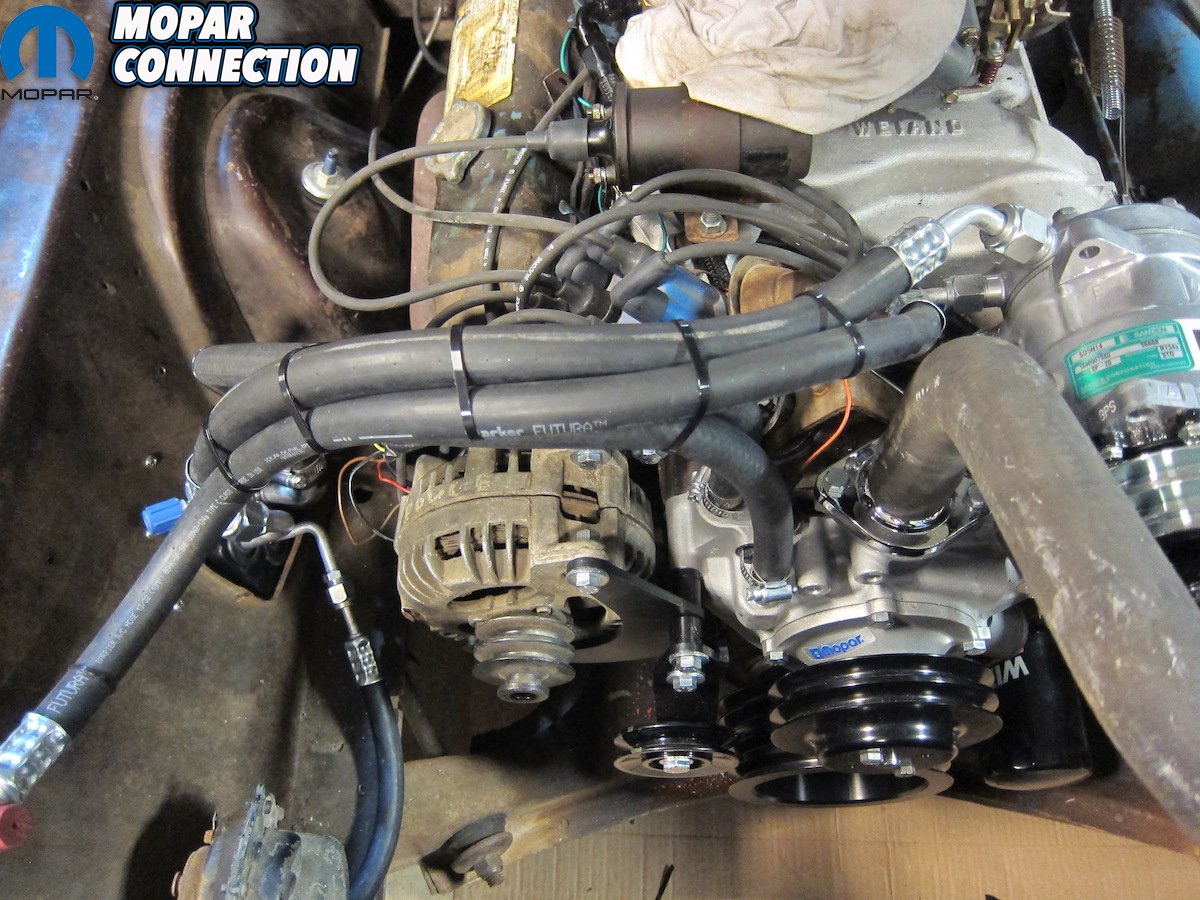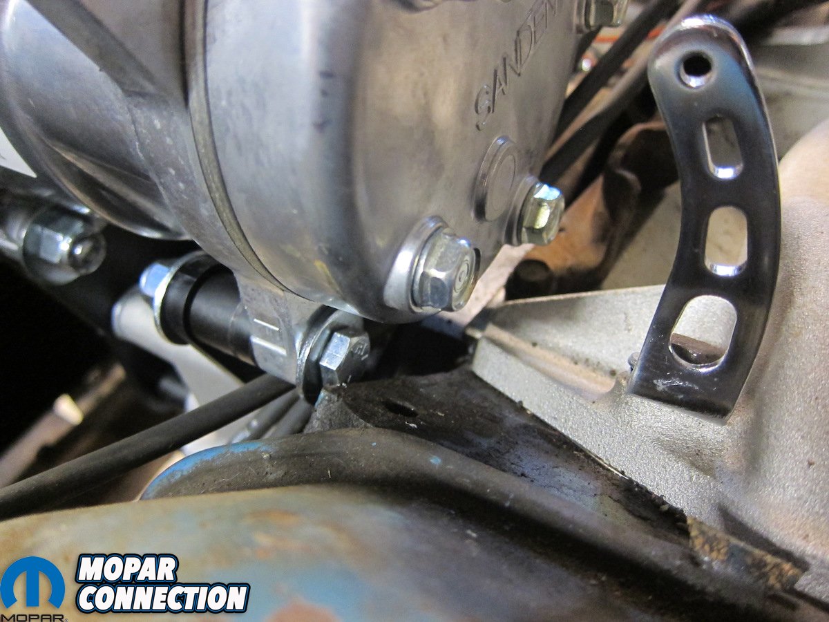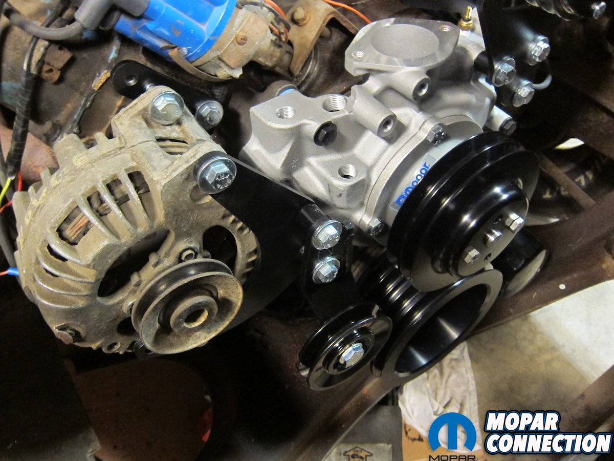 Since our Satellite was equipped with strong-arm steering, we didn’t have to worry about a power steering pump getting in the way. However, the compressor belt loop includes the alternator, so the lack of a power steering pump left us without a way to tension the belt for the water pump. Of course, Vintage Air had already thought of that with their water pump tensioner kit (P/N 166009). With a simple bracket, idler pulley, and two bolts, the tensioner was a breeze to install. Tightening the belt was easy too since the idler bracket includes a 1/2” square drive for a ratchet.