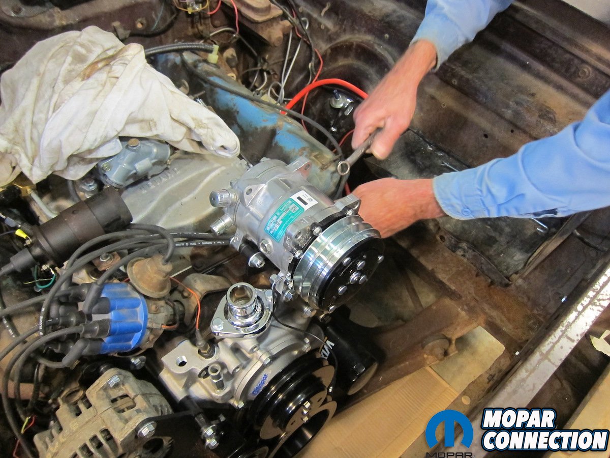 The final big component was the new Sanden compressor. We happened to have a 1973-vintage RV-2 in the scrap pile, so we threw them both on the work bench for a quick comparison. Of course, the massive RV-2 dwarfs the Sanden in every aspect. Outside of an OEM restoration, we couldn’t see the need to ever put an RV-2, that horsepower-robbing anchor, on an engine after seeing such a huge difference between the two.