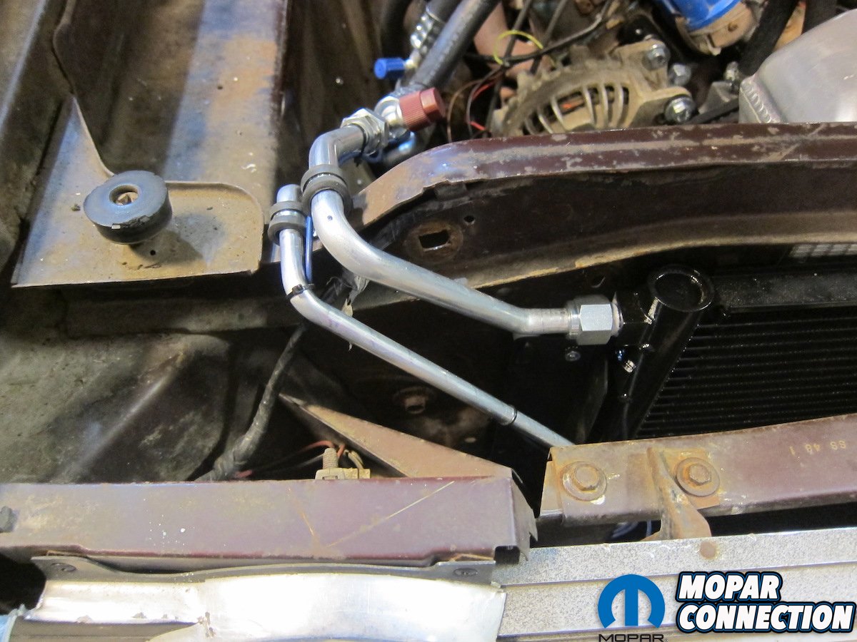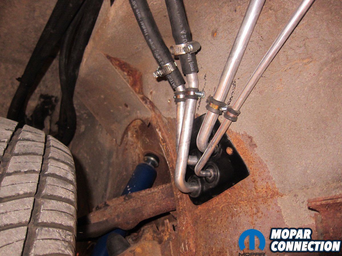 Refrigerant and coolant hose routing really spoke to the cleanliness of the Surefit kit. Rather than cluttering up an engine bay with tentacles of hose running in every direction, Vintage Air chose to route the lines under the fender and through the factory alignment access plate hole on the inner fender. We threaded the hoses through the firewall holes we drilled earlier, then up to the trick molded cover plate with grommets and hardlines to make the transition into the engine bay. It doesn’t get much cleaner than that.