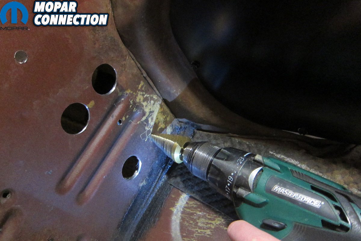 To begin the installation, we started back in the interior. Since the new evaporator draws air from inside of the car rather than from the cowl like the original heater box, a block-off plate is included. Using the plate as a template, we marked and drilled the holes, then fastened the plate with a thin bead of silicone and the supplied hardware. Next up was a set of holes for incoming and outgoing antifreeze and refrigerant lines. Measurements were supplied in the instructions, so we made ourselves a template, punched the holes with a step drill bit, and pushed the necessary grommets in.