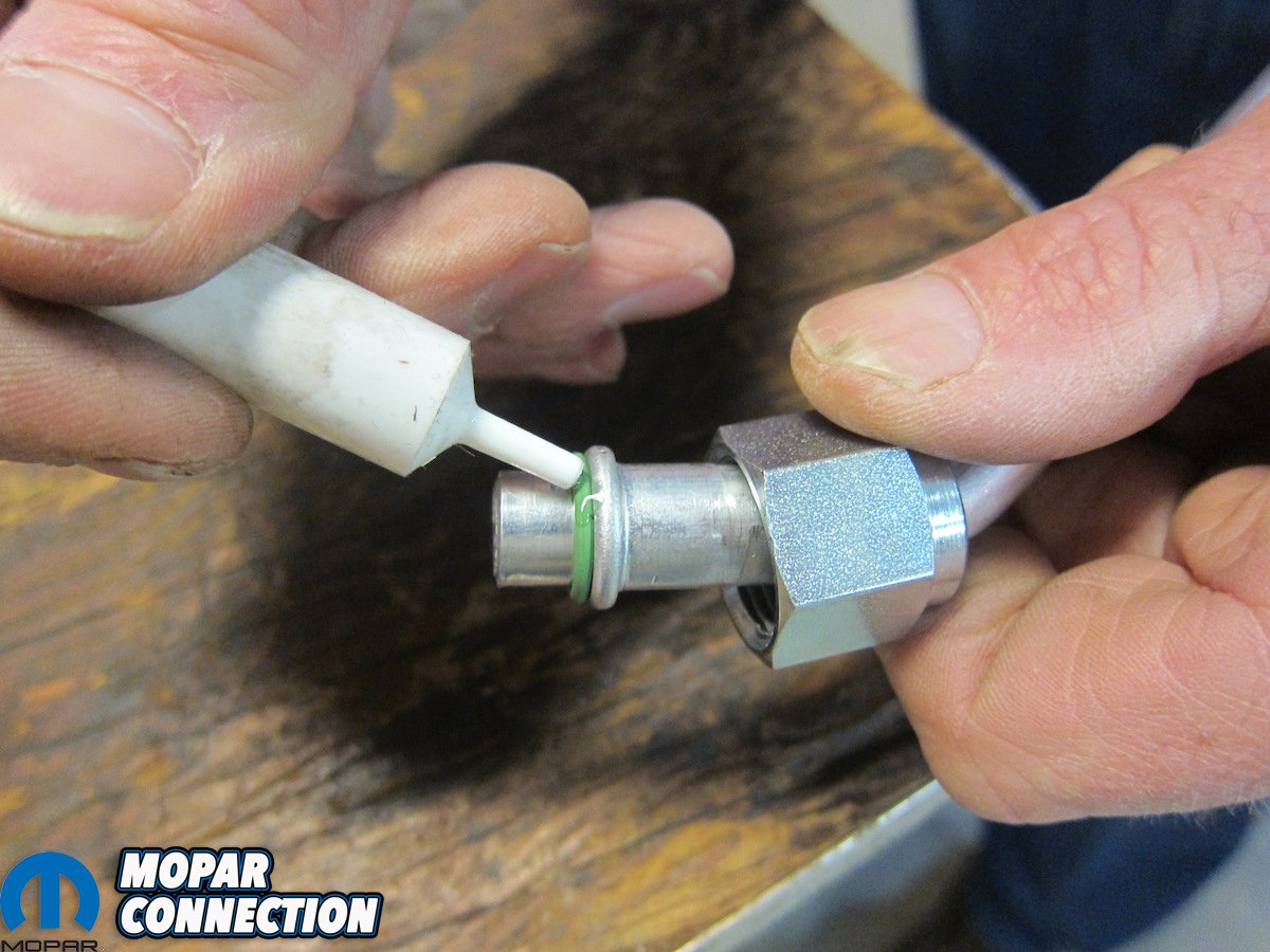 Above: O-rings were oiled before lines were connected to the evaporator. The firewall bracket was put on while on the bench.
