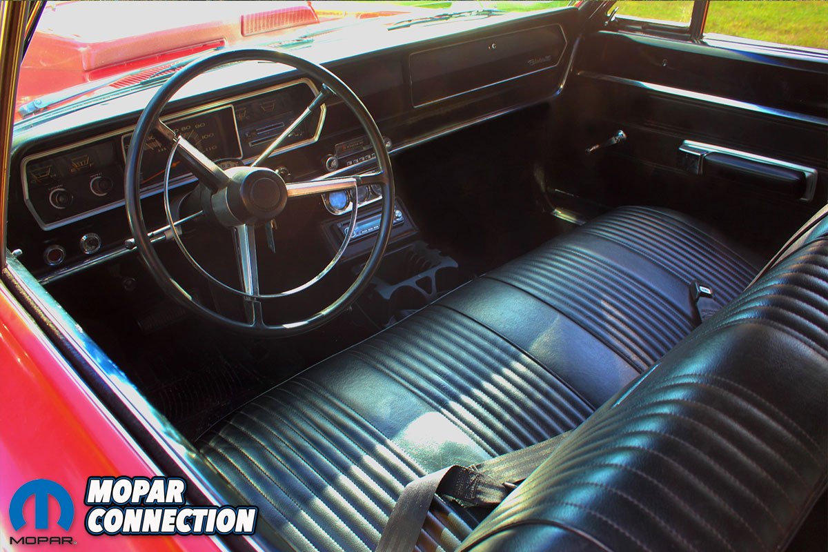 The black bench seat in the front contrasts well with the rich, supple vinyl interior, providing a showroom appearance that might make the average enthusiast think they went back in time to 1967. The instrument panel is all original and beautiful, featuring an inside rear view mirror with a safety inside arm and an outside mirror on the driver side, a standard feature on the Belvedere. The Belvedere II also has its standard safety feature items, such as safety action inside door handles, front and rear seat lap belts, backup lights, and electric windshield washers, providing comfort and convenience for a weekend pleasure cruise.