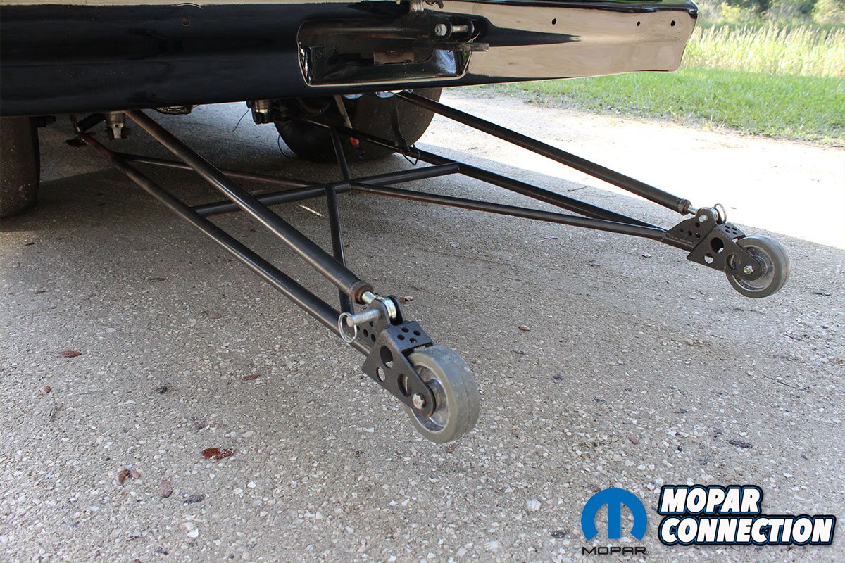 The Duster sports Mickey Thompson 26x15x3.5 Front Runner tires in the front and 31x15x13 Slicks in the rear, with an overall vehicle weight of 3,000 lbs. An aero scoop is visibly mounted on the Duster’s hood to produce a low drag coefficient, while the rear is connected to a custom rear wing and wheelie bars, ready for maximum straight-line grip. The interior is race ready, and the steering wheel and a Cheetah brand gear shifter are within arms reach. It is accommodated by a Wilson Manifold nitrous oxide system for maximum boost over the competition.