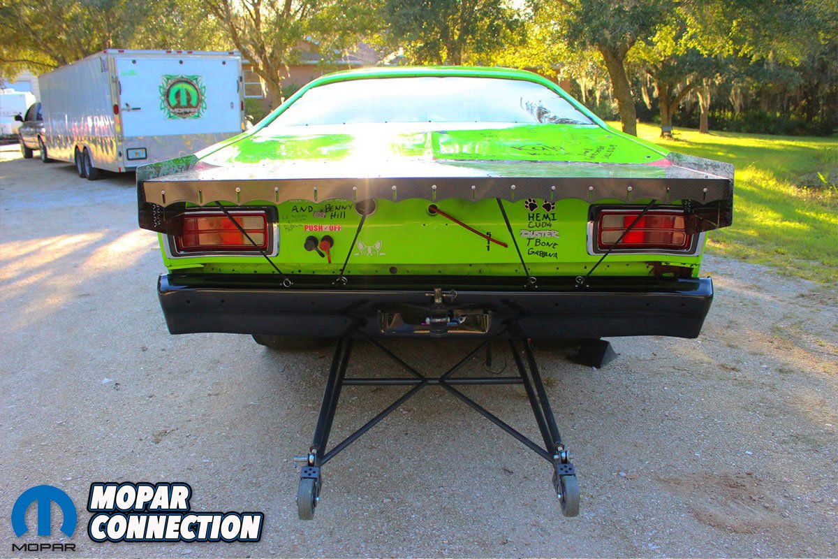 While working on the ‘Cuda, David added another Mopar to the collection: a 1973 Plymouth Duster race car. Owned for 12 years, the Duster is a sight for looks and straight-line pickup, a car David purchased on eBay from a seller in Michigan. “I sent a friend to drive up to Michigan and pick up the Duster because I could not take off work at the time,” David said. “We brought it back and had someone paint it Sublime Green. Later, I had a friend who said he would build me a wing for it. It had like a fiberglass spoiler on the rear, and when he took it off there was an orange line with an insignia that said ‘Owned by Grant Grebeck’.”