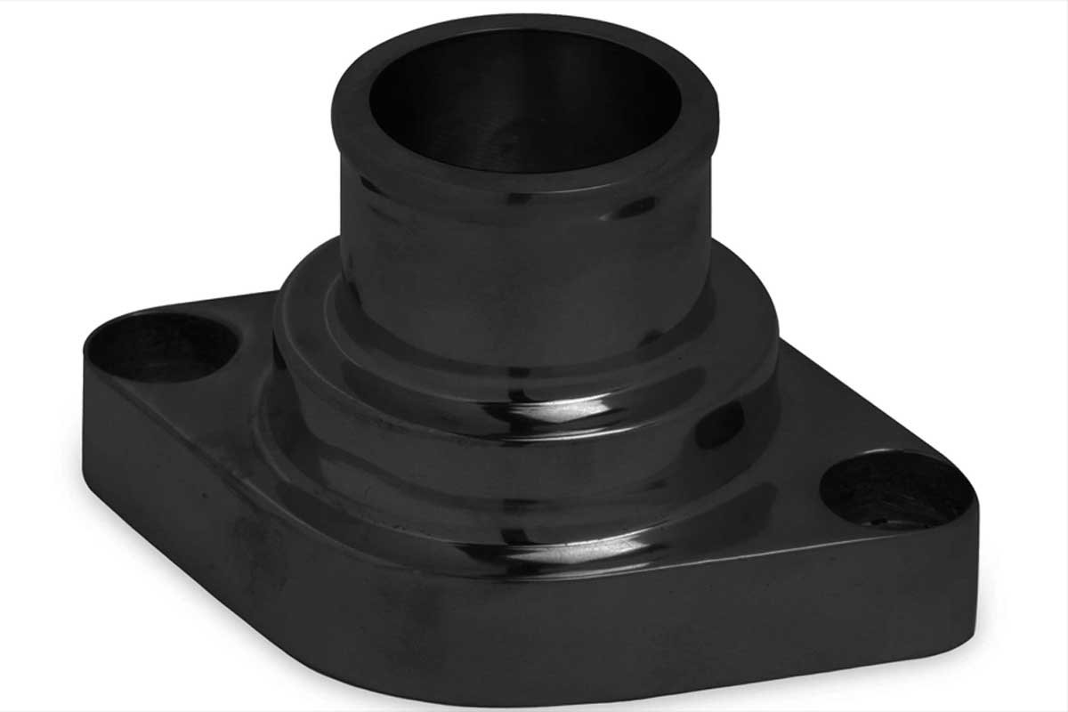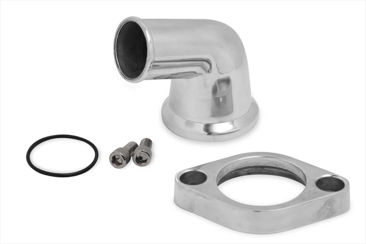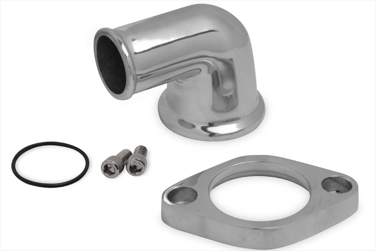 Above: For proper routing of the upper radiator hose, Weiand has several water outlet designs to fit any imaginable angle necessary.