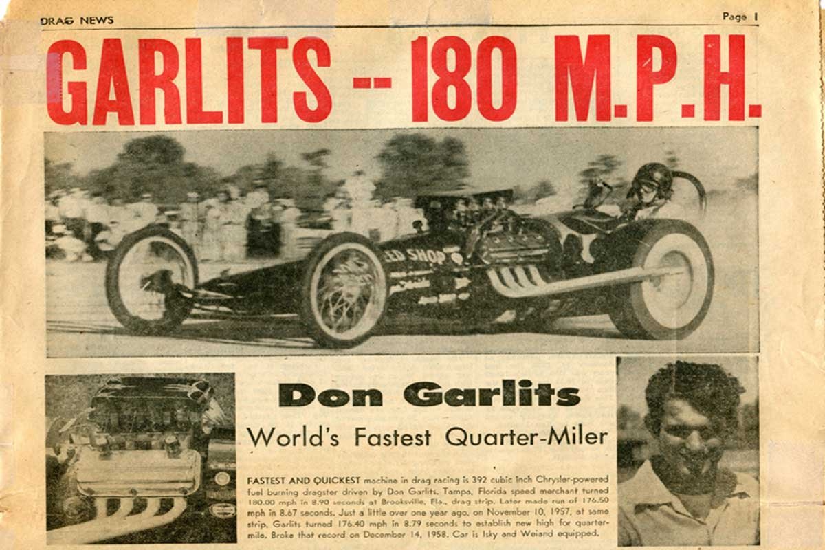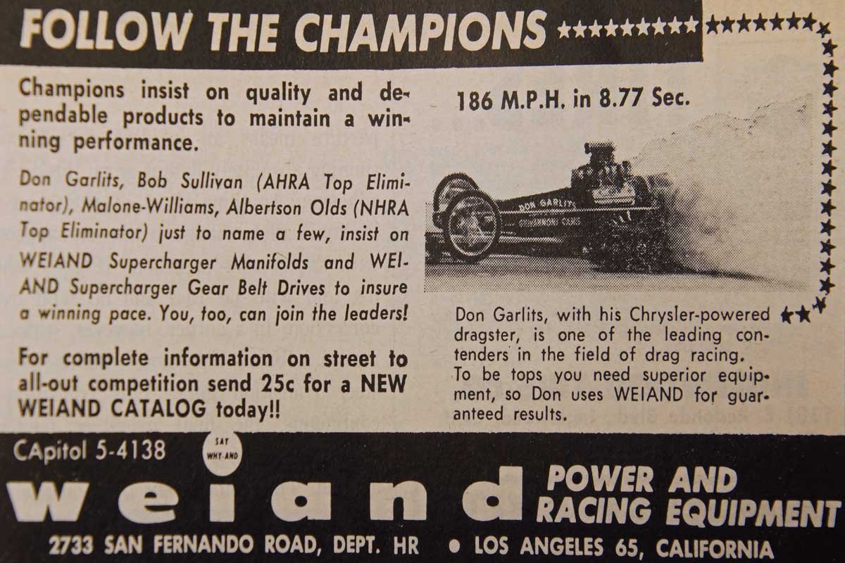 Over the years, for quarter-mile motivation, Garlits utilized flathead Ford engines, Buick Nailheads, and blown small-block Chevys until relying on an array of Gen I and II Hemis and Donovan 417 engines on either gasoline or nitromethane (the NHRA outlawed nitro in the late 50s into the early 60s). Early in his career, he used Weiand Power and Racing Equipment products as depicted in the 1961 Hot Rod Magazine ad. Garlits relied on Weiand to propel the supercharged SR 1-B to an 8.77et at 186 MPH while putting it in the winner’s circle.